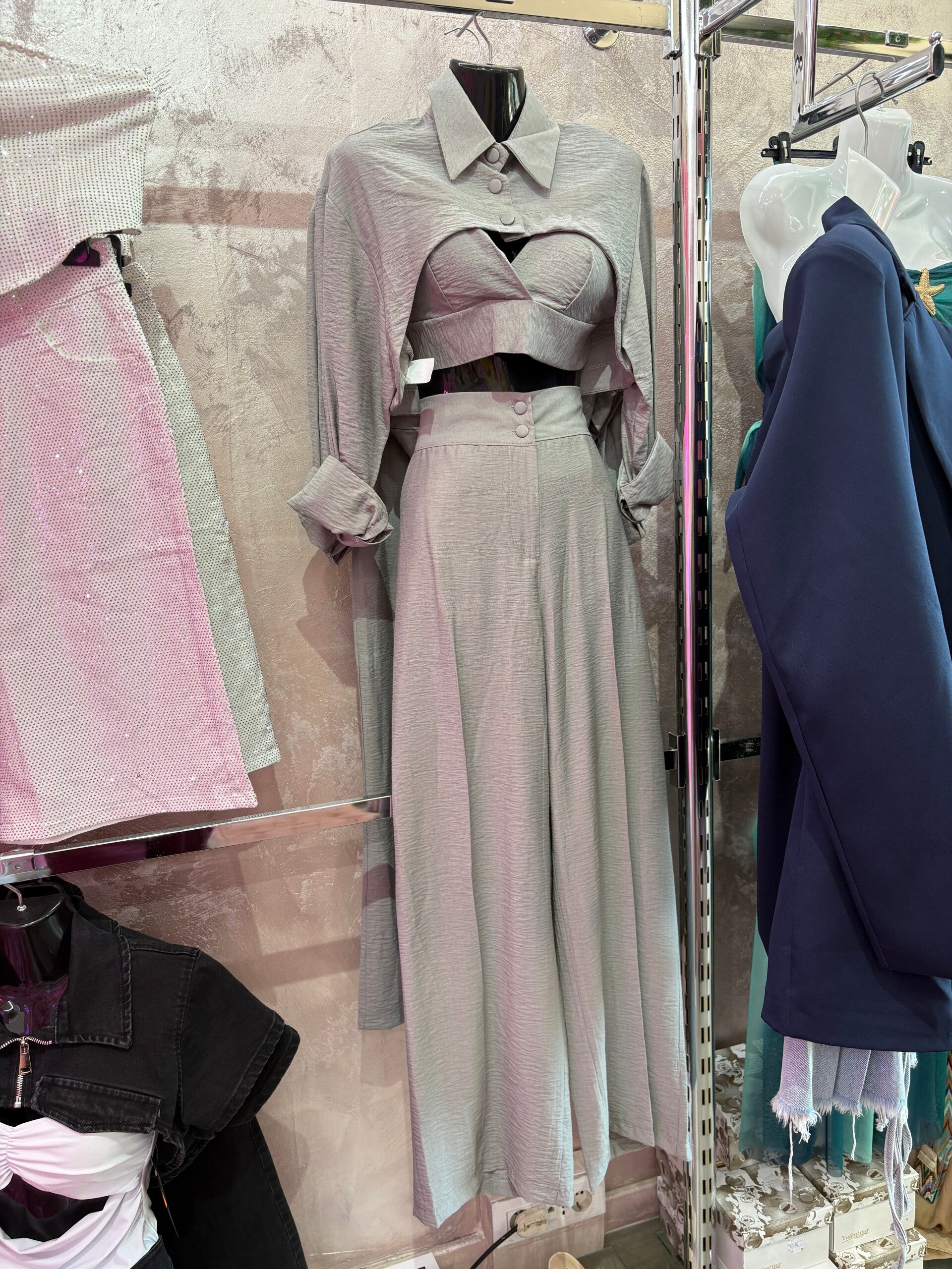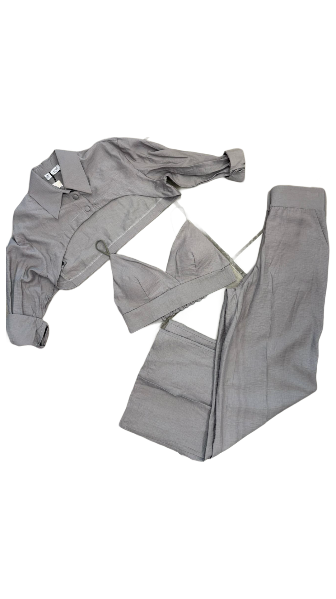Questo set include una camicia a copri spalle, un top con coppe dal design raffinato e bretelle regolabili per una vestibilità perfetta. Realizzato in tessuto simil lino, garantisce freschezza e comfort, rendendolo ideale sia per i look casual che per quelli più eleganti