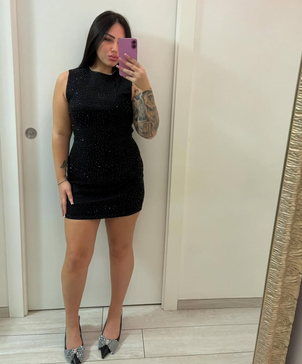 Tessuto in denim elasticizzato, i brillantini donano un effetto "gocce d'acqua"
