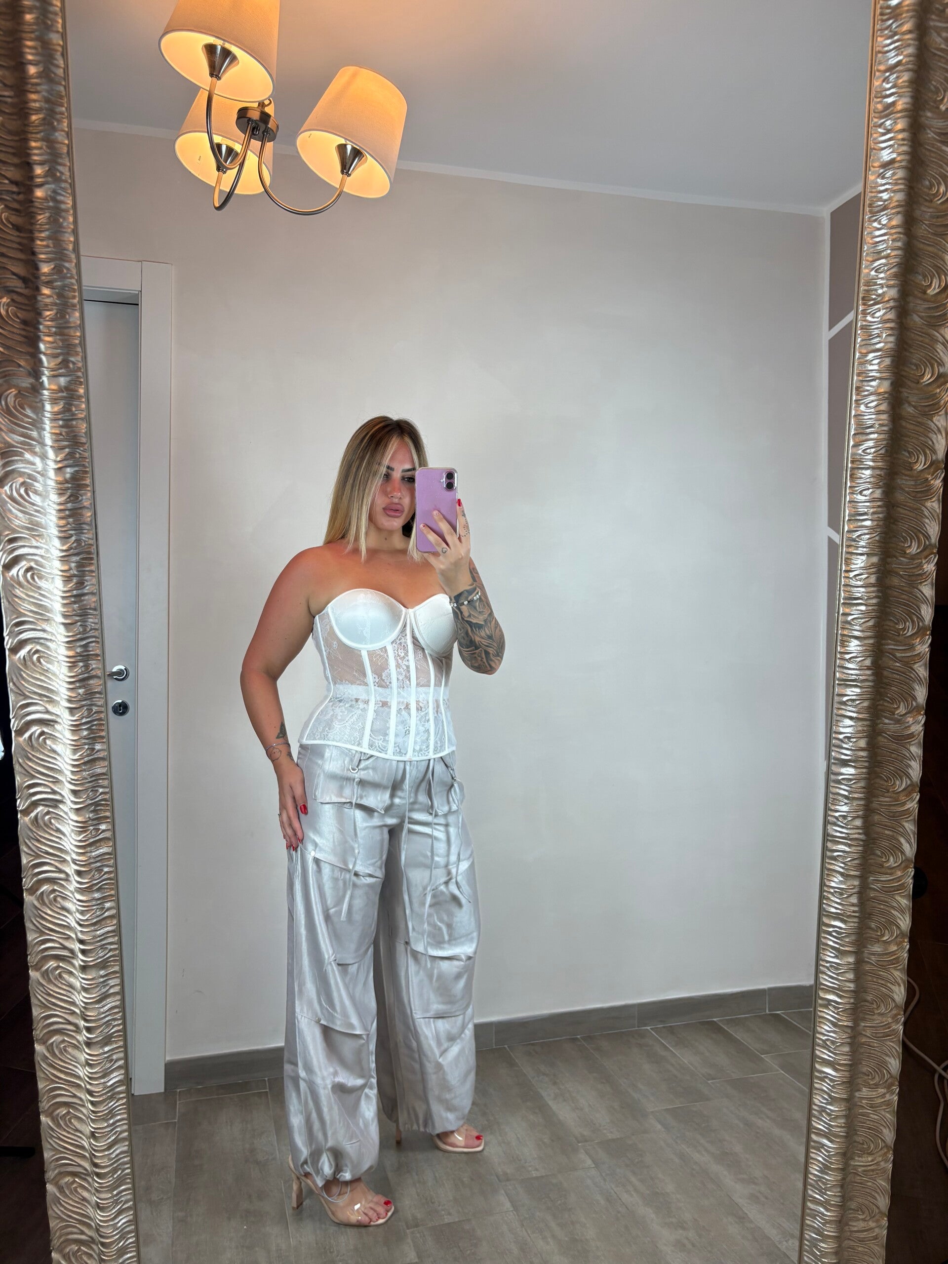 Il pantalone è taglia unica ma calza da una xs ad una xl. Presenta coulisse sulle caviglie tessuto raso