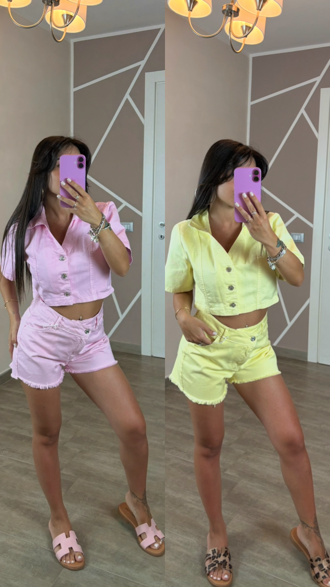 Il coordinato presenta pantaloncino e giacchettino di jeans
