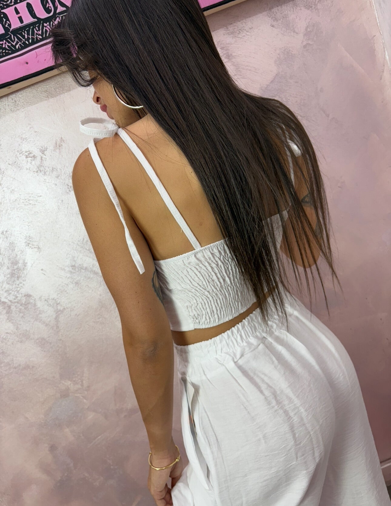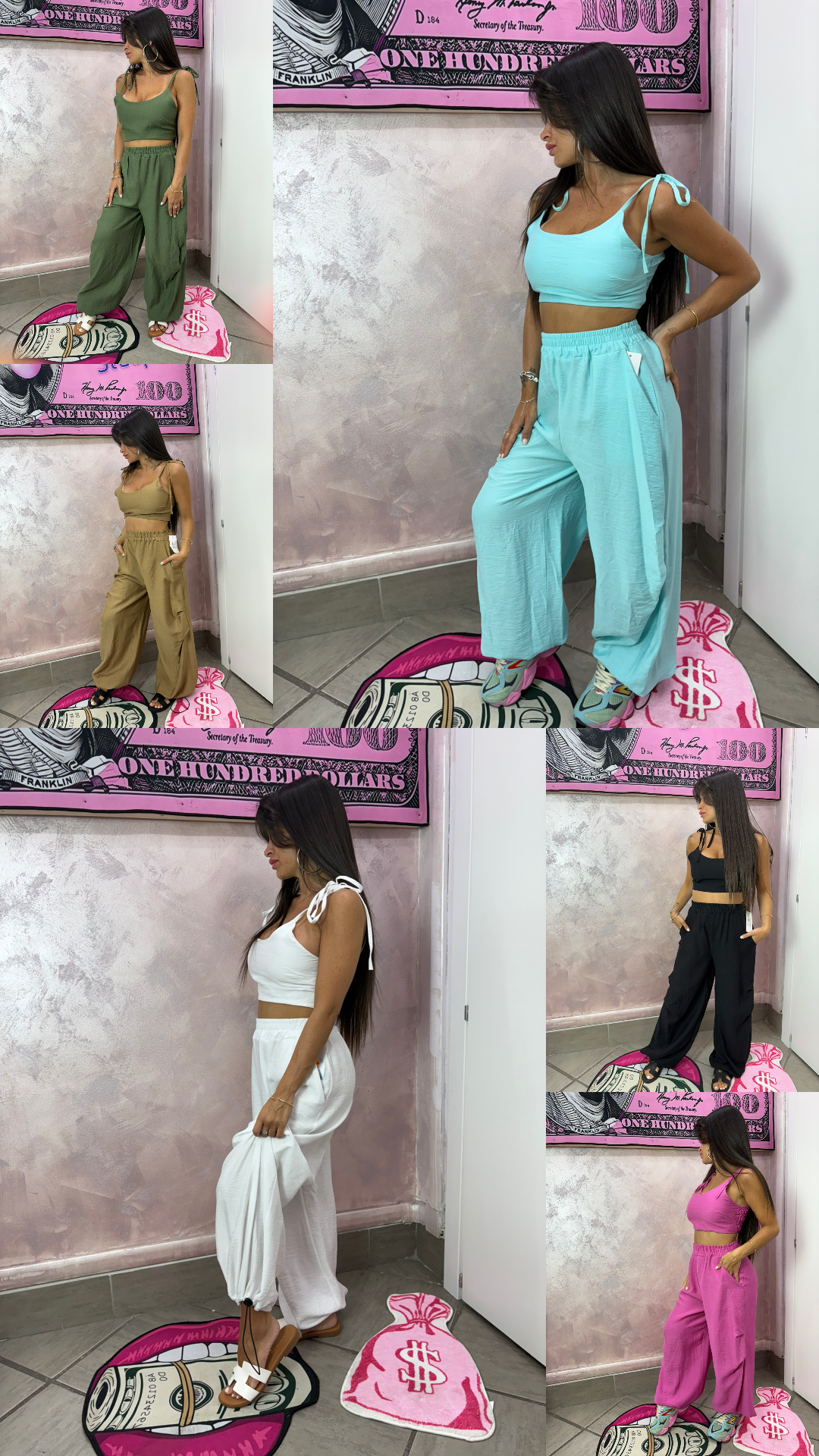 Completo due pezzi leggerissimo, perfetto per affrontare l’estate con comfort e stile. Il top a spalline sottili regolabili è abbinato a un pantalone ampio con vita elasticizzata sul retro per una vestibilità versatile e comoda. Il pantalone presenta anche un elastico sul fondo caviglia, così puoi regolarlo e creare l’effetto balloon o lasciarlo più morbido. Un set ideale per look casual, streetwear o per rilassarsi in vacanza. taglia unica ma calza da una xs a una xl
