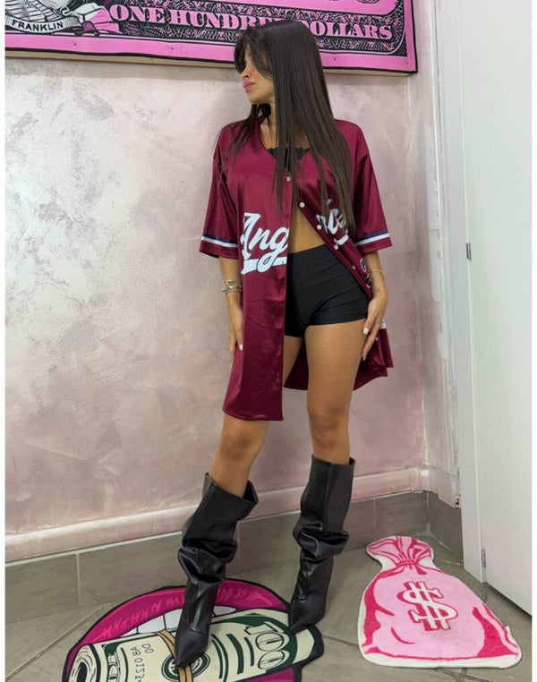 Questa maglia è in stile oversize, con chiusura a bottoni frontale e maniche corte, ispirata alle classiche baseball jersey. Presenta scritte e numeri applicati sul davanti, con dettagli sportivi che richiamano l’abbigliamento universitario e da squadra. Ha un taglio dritto, ampio, che arriva a metà coscia, perfetto per essere indossato anche come mini-abito streetwear. Taglia unica ma calza da xs a xl