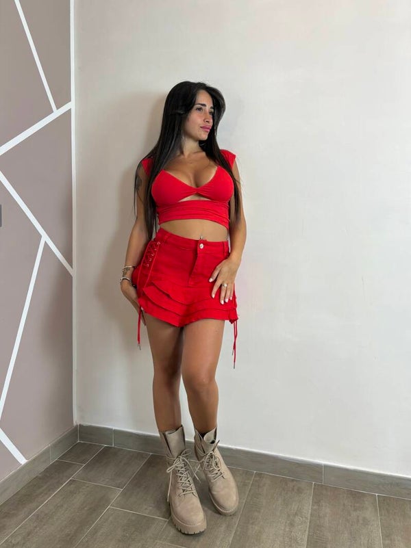 Realizzato in denim rosso fuoco, unisce la praticità del pantaloncino alla sensualità della mini con balze. Il dettaglio con lacci laterali dona un tocco corsetto che scolpisce la silhouette, mentre le balze sul fondo aggiungono volume e movimento. Vita regolare, chiusura con zip e bottone. Taglia unica, veste perfettamente dalla S alla L. TESSUTO SUPER ELASTICO