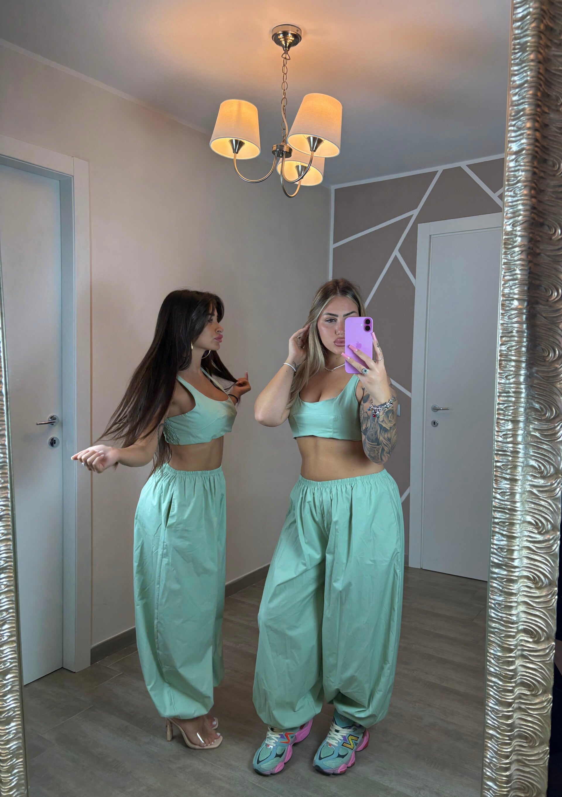 Completo due pezzi con top a fascia strutturato e pantalone modello parachute a vita alta con elastico in vita e alla caviglia. Il tessuto leggero lo rende ideale per look streetwear o casual chic.