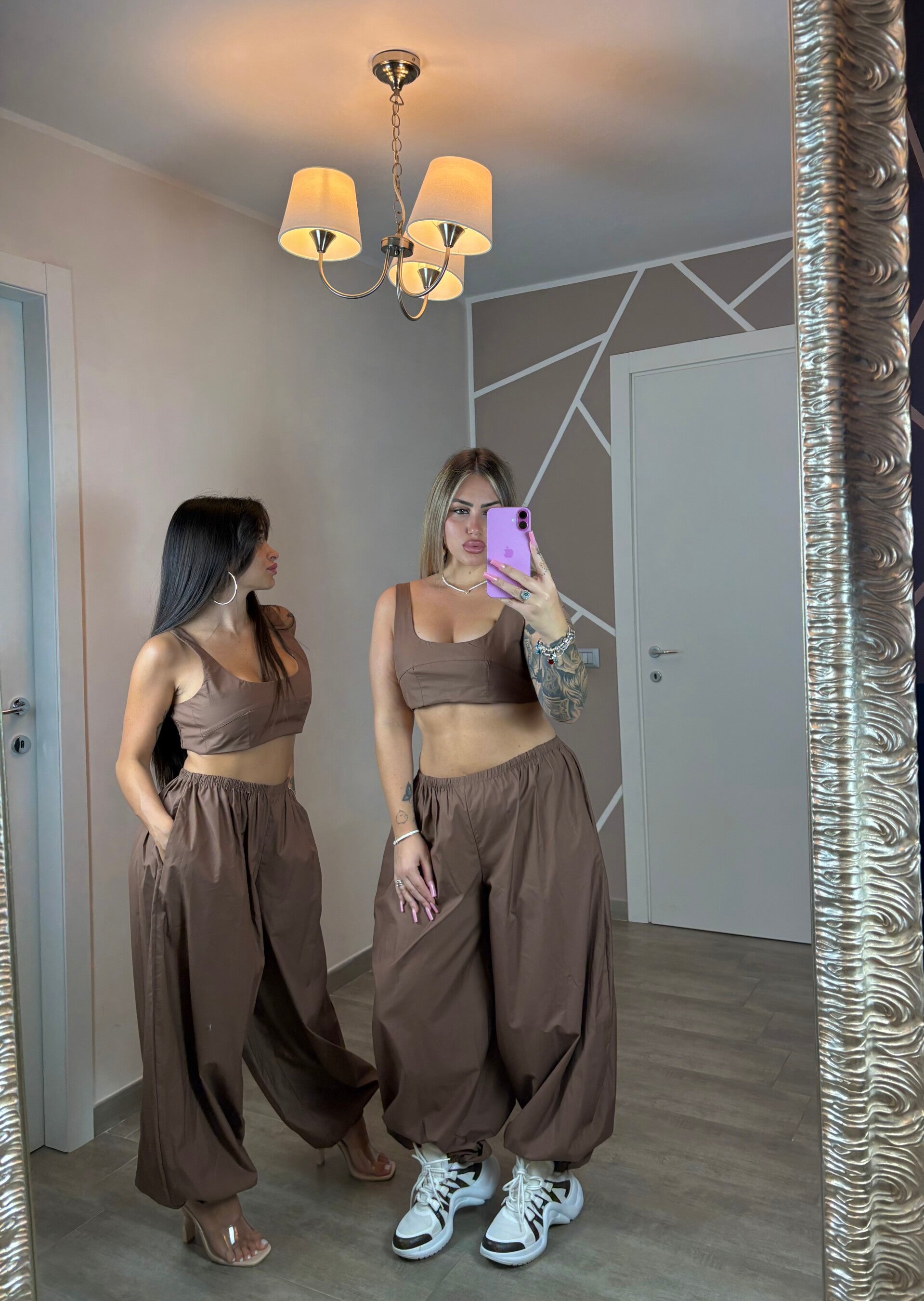 Completo due pezzi con top a fascia strutturato e pantalone modello parachute a vita alta con elastico in vita e alla caviglia. Il tessuto leggero lo rende ideale per look streetwear o casual chic.