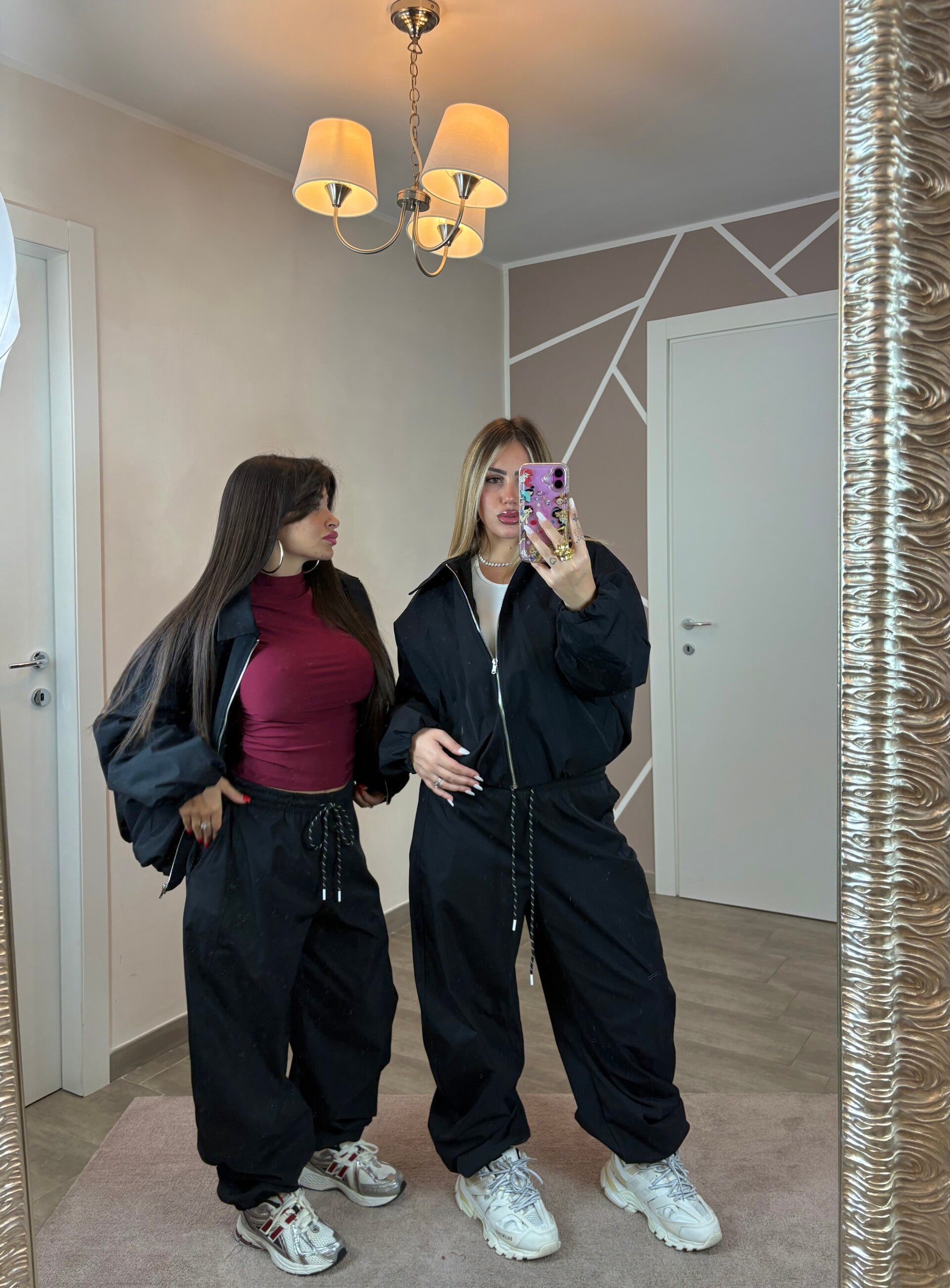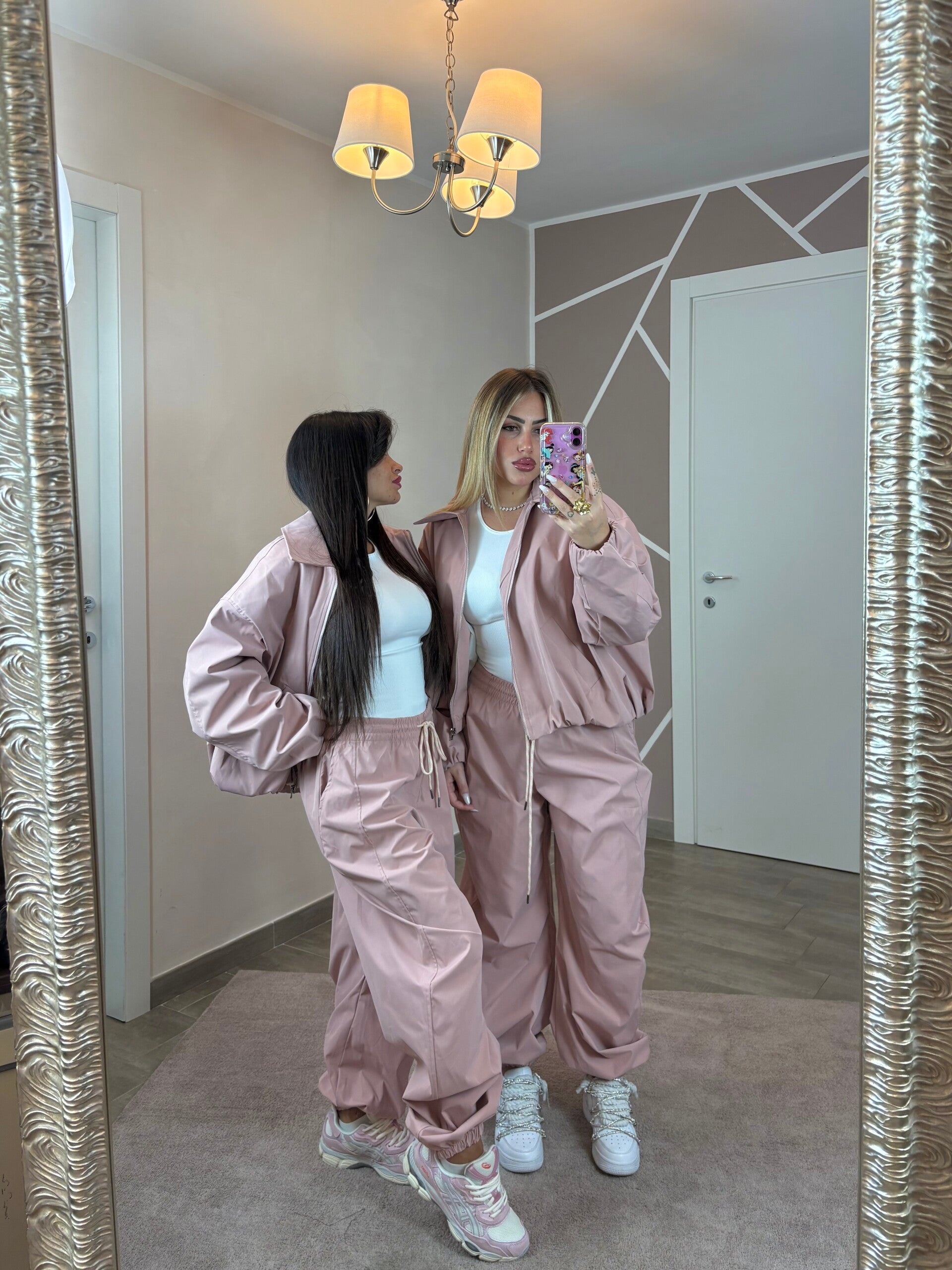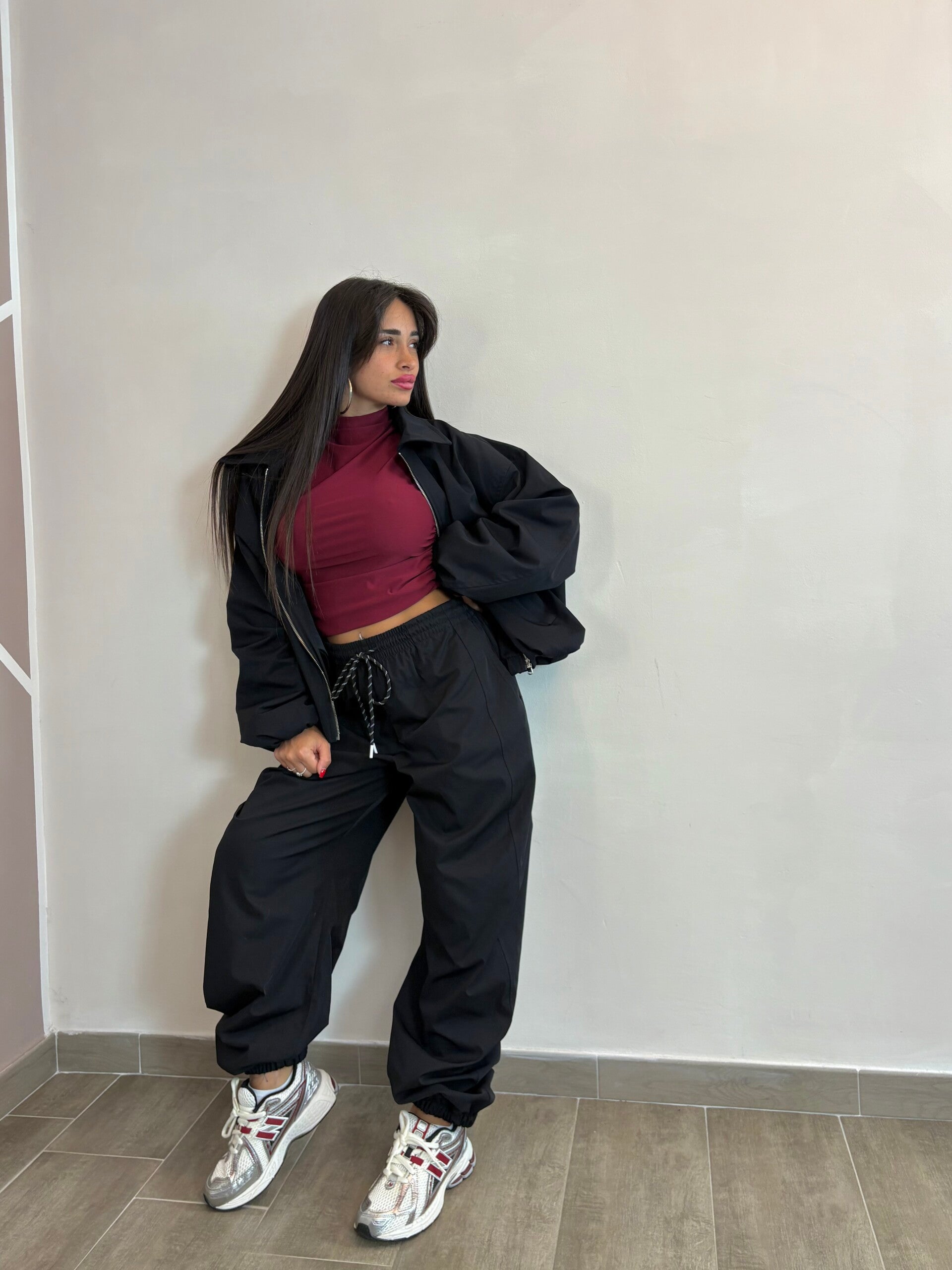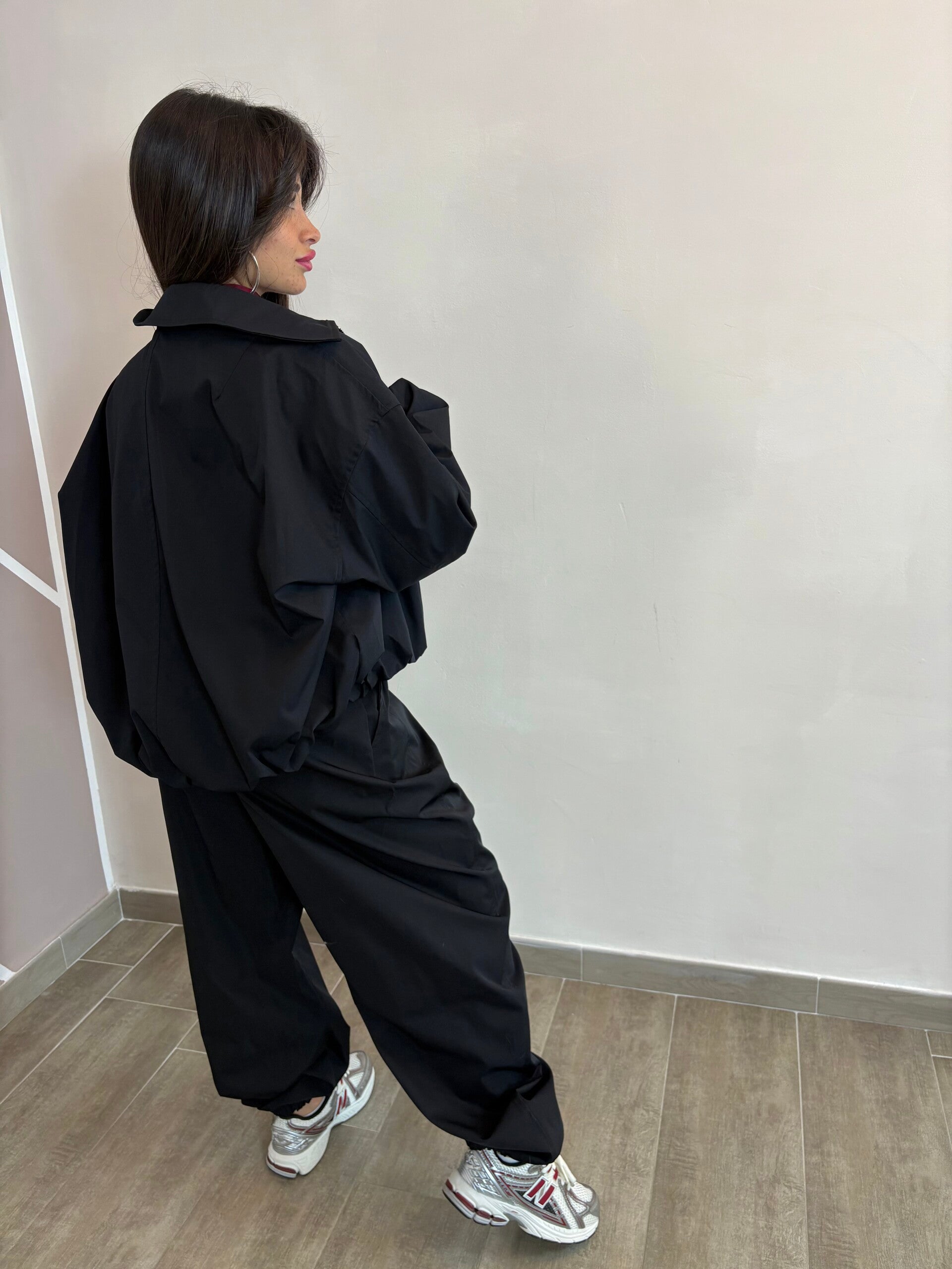 Coordinato due pezzi con giacca over e pantalone a vita alta con coulisse regolabile. La linea morbida e comfy lo rende perfetto per outfit streetwear ma sempre chic. Disponibile in due varianti colore: rosa cipria per un look più delicato e nero per un vibe deciso e grintoso.