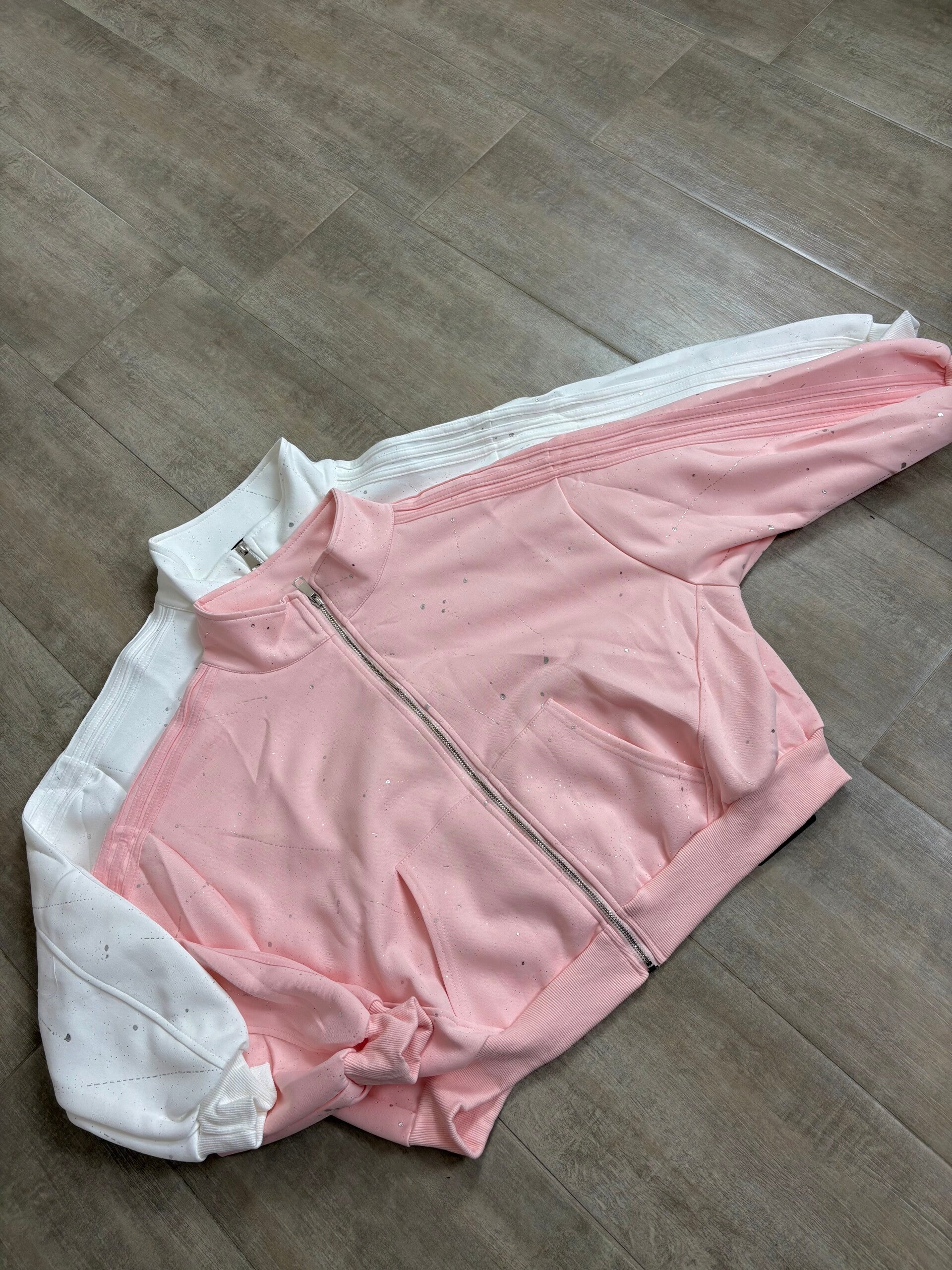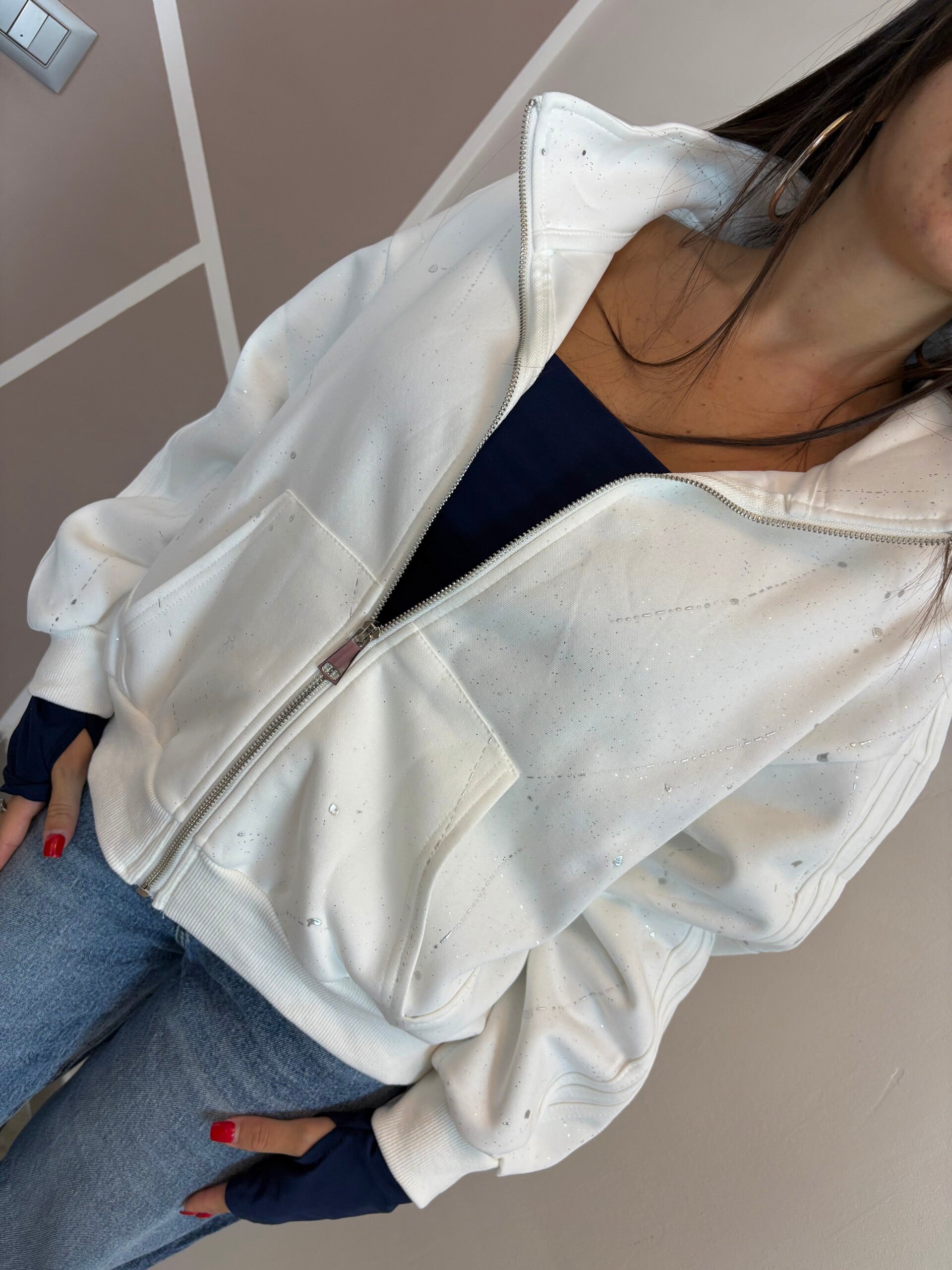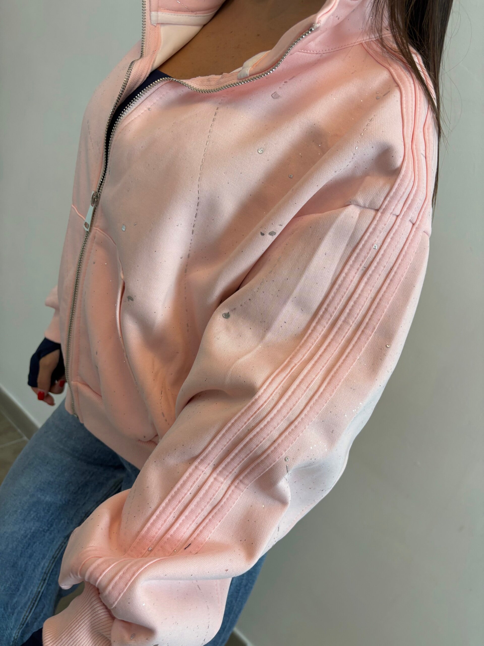 Felpa con zip in tessuto morbido e confortevole, caratterizzata da dettagli glitter effetto spruzzato che donano luminosità e originalità al capo.