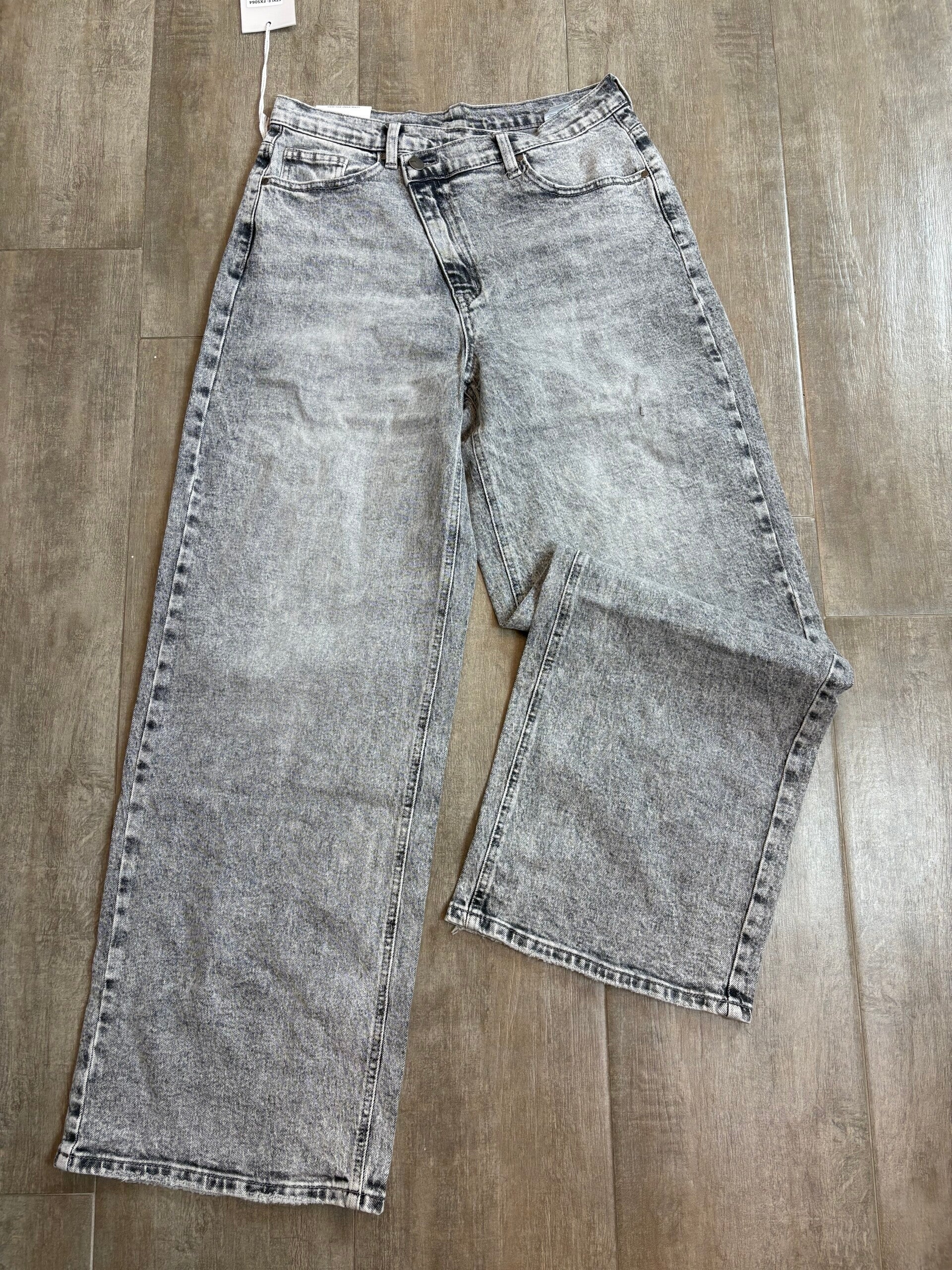 Jeans a gamba larga in denim grigio con lavaggio acid wash. Vita alta, fit morbido e linea dritta che slancia la figura senza rinunciare alla comodità. Un capo versatile e super trendy, ideale per creare look urban e streetwear di carattere.