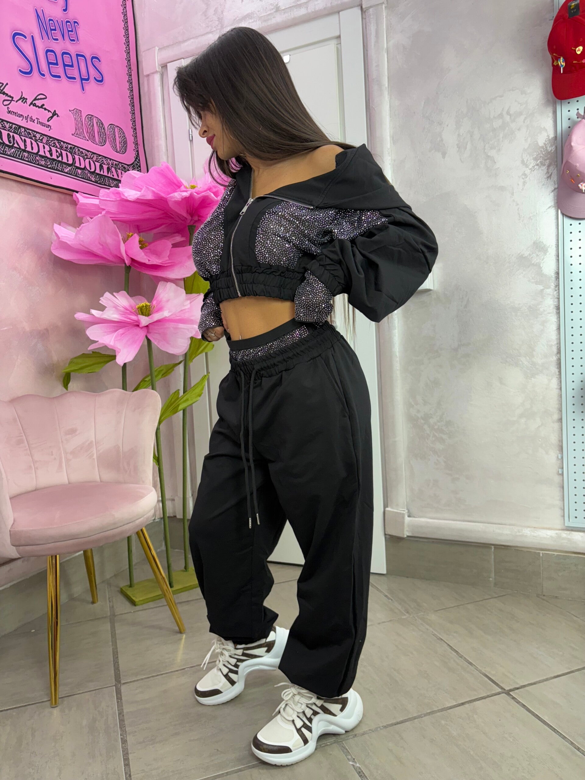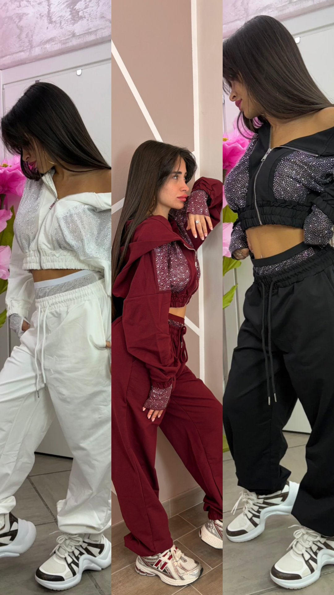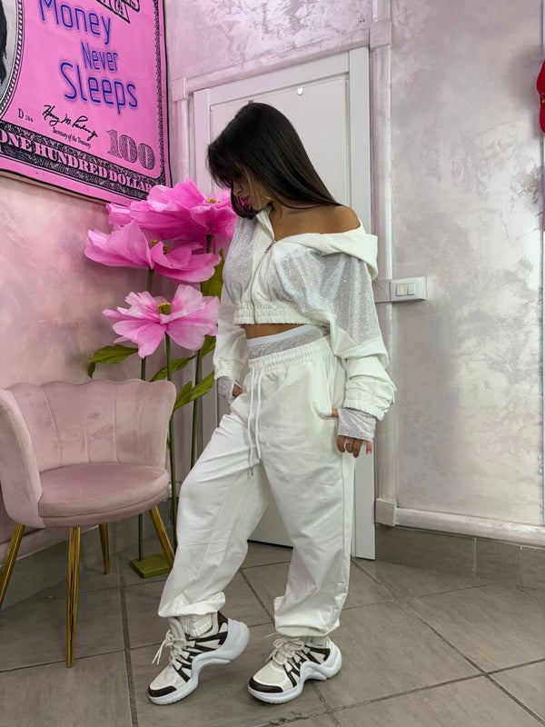 Completo coordinato in tessuto leggero, composto da felpa crop con cappuccio e zip frontale, impreziosita da dettagli glitterati effetto strass su maniche e busto. Polsini ed elastico in vita rifiniti per garantire comfort e vestibilità. Pantalone a vita alta con fascia elastica e coulisse regolabile, gamba ampia con fondo elasticizzato. Una tuta che unisce comfort e streetwear con un tocco glam scintillante, perfetta per outfit casual ma sempre di impatto. Calza da una xs a una xl