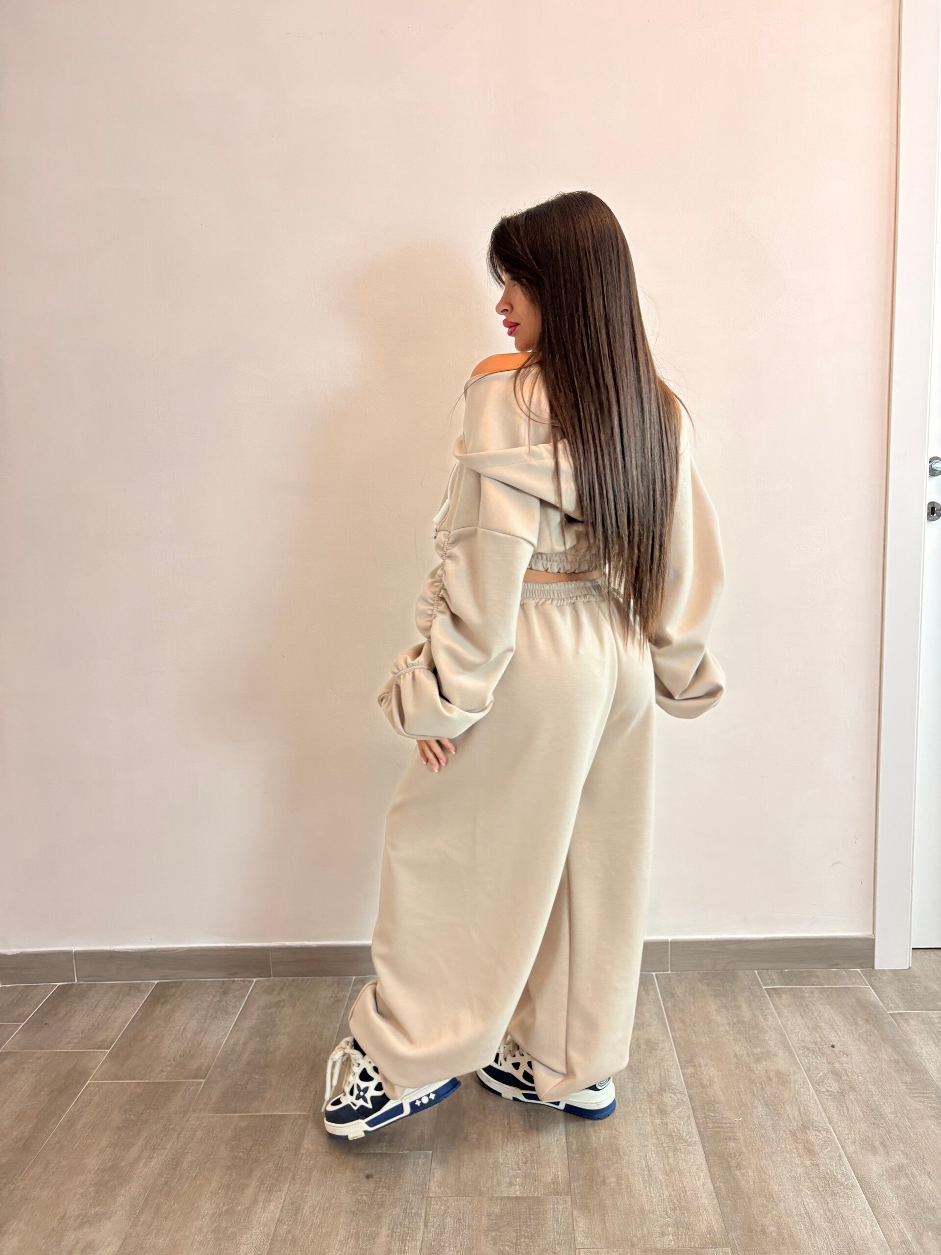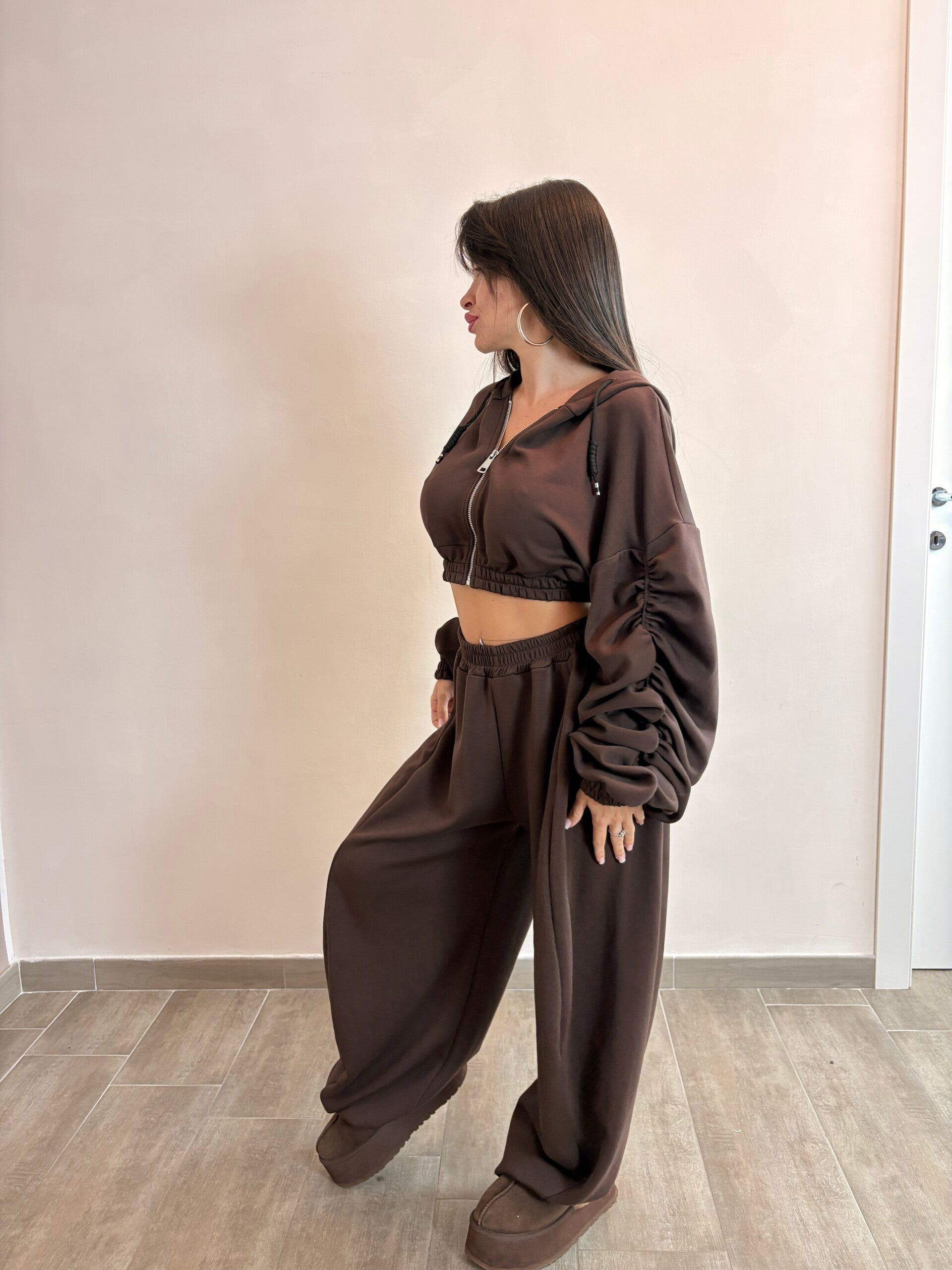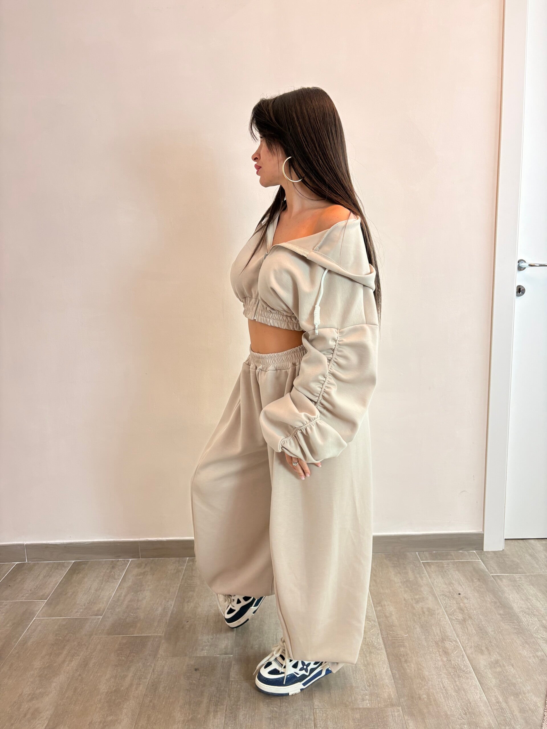 Il modello è composto da felpa cropped con cappuccio e arricciature sulle maniche che donano un tocco femminile e di tendenza, e pantalone a gamba dritta con elastico in vita per il massimo comfort.