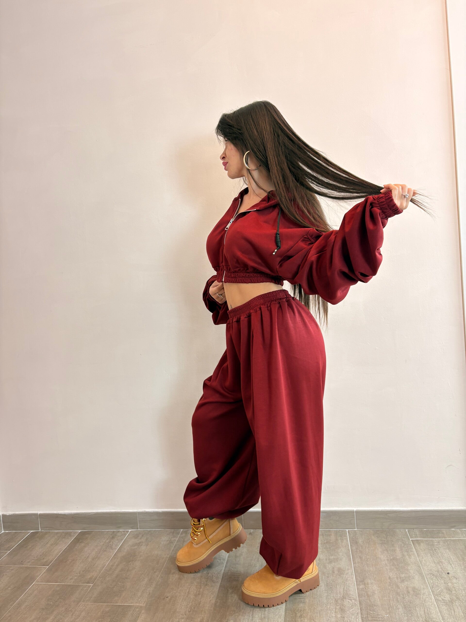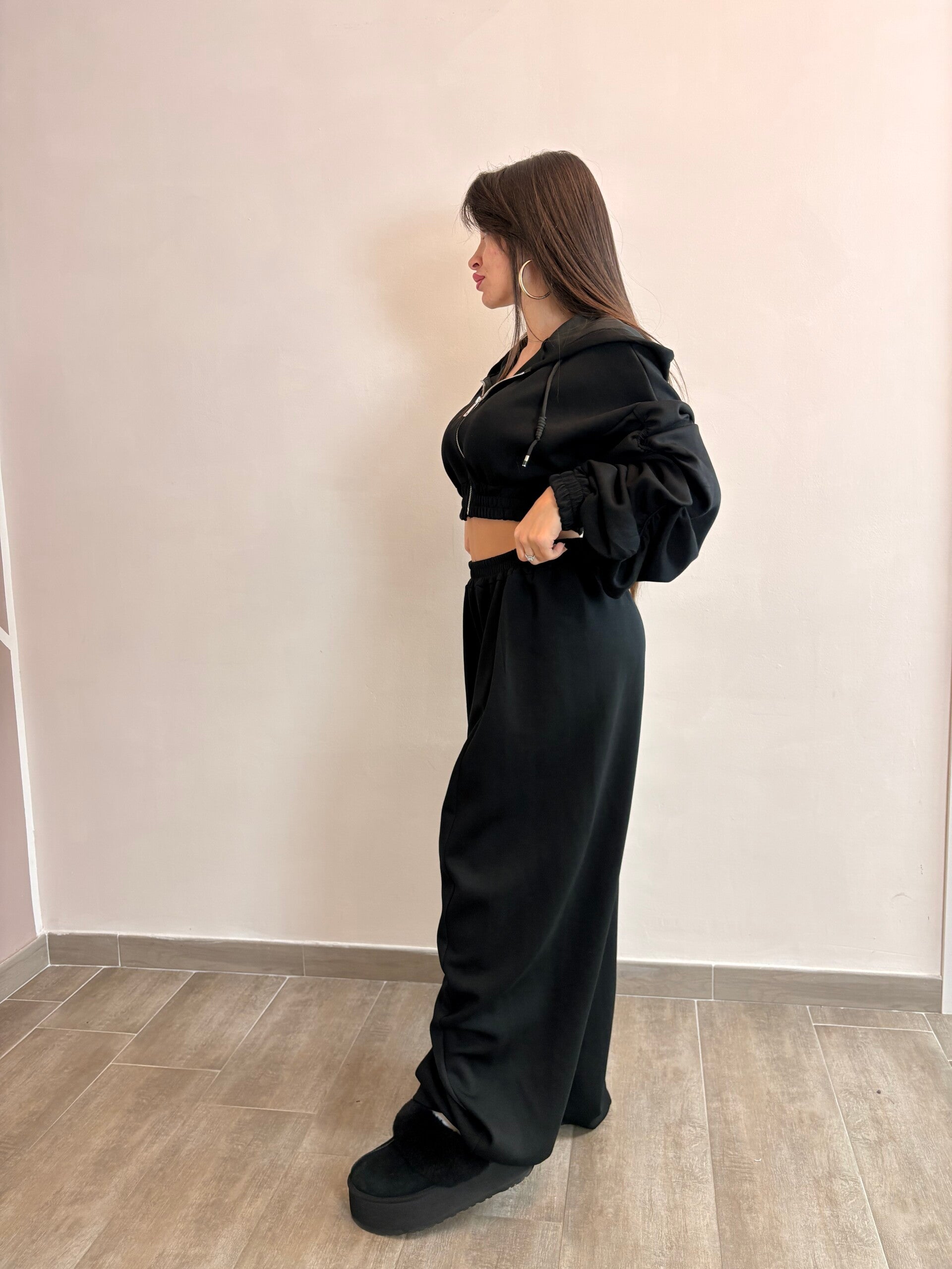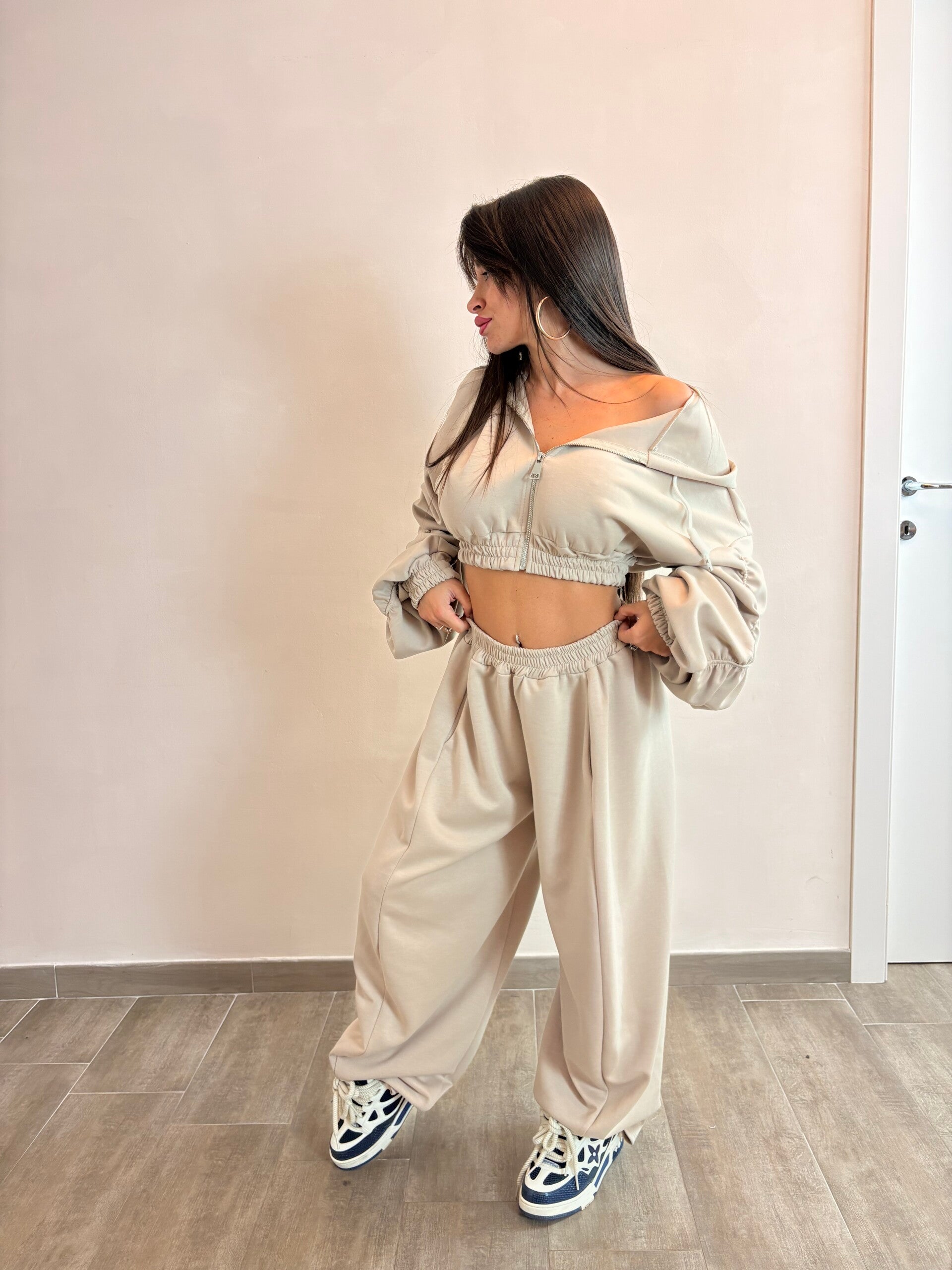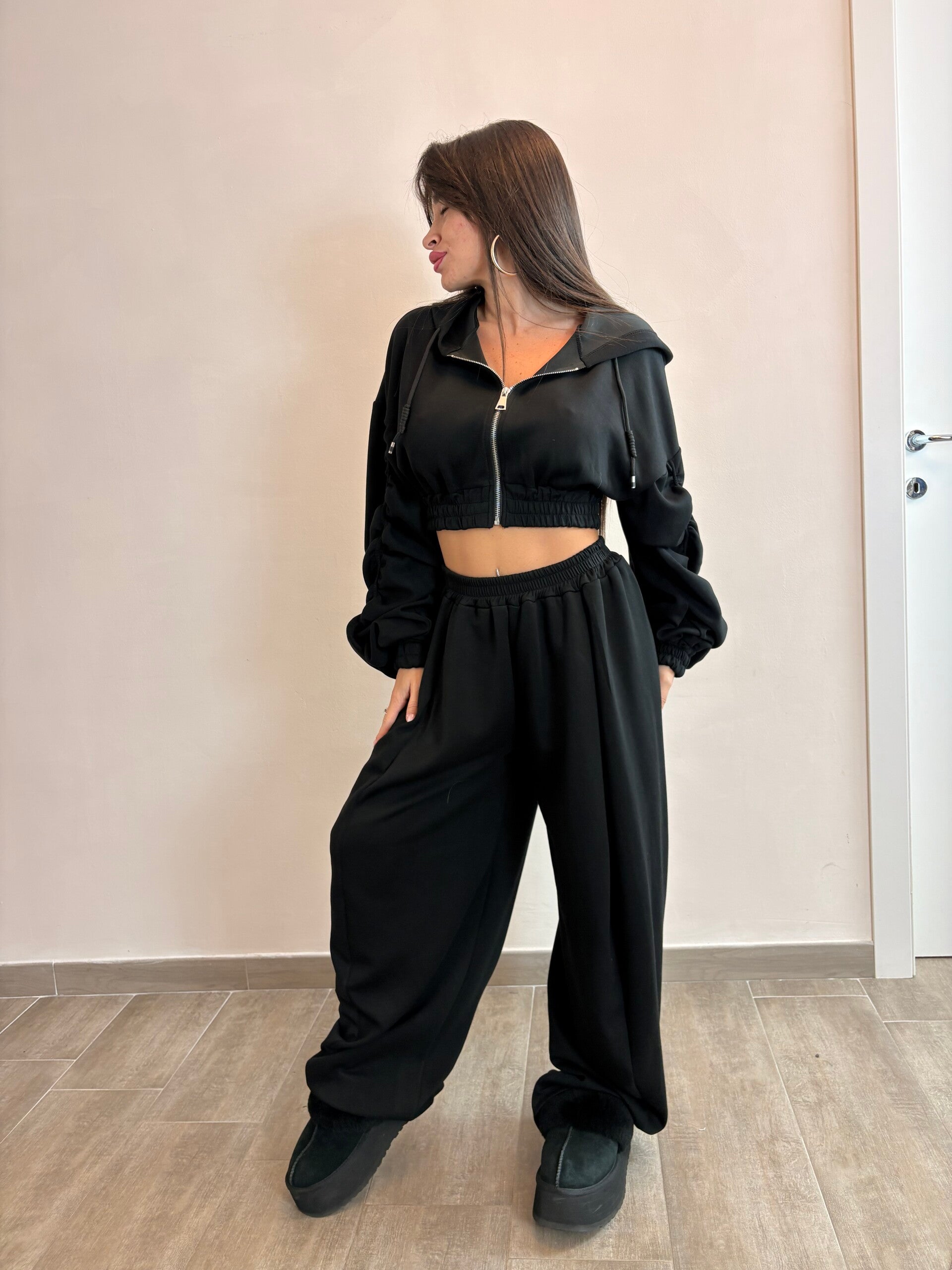 Il modello è composto da felpa cropped con cappuccio e arricciature sulle maniche che donano un tocco femminile e di tendenza, e pantalone a gamba dritta con elastico in vita per il massimo comfort.