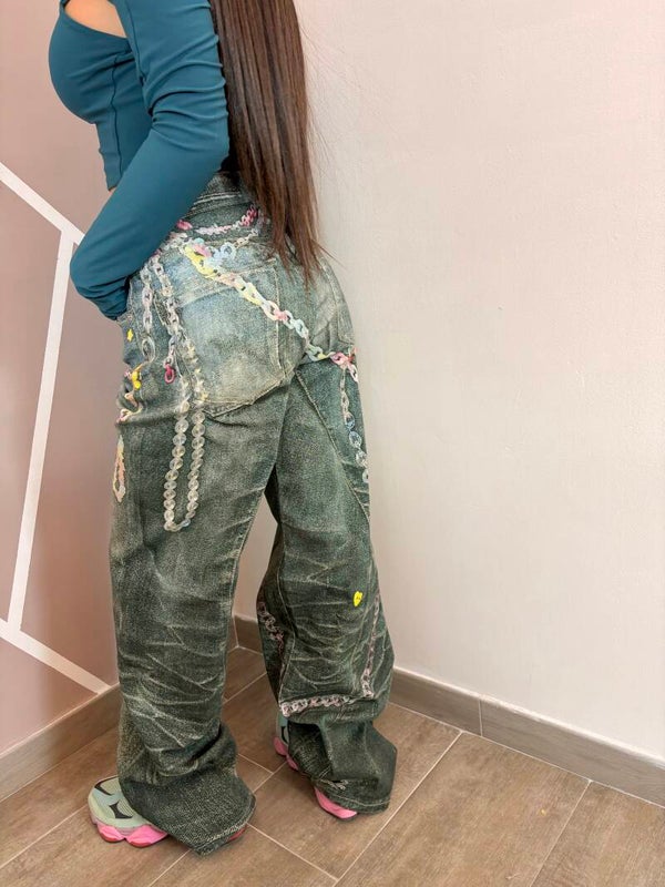 Jeans modello baggy a vita bassa, in denim effetto vintage con stampa 3D di catene e charms colorati. Tessuto elastico
