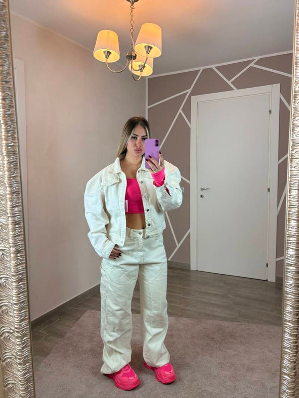 Coordinato in denim color panna, composto da giacca oversize e pantalone cargo con tasche laterali e vestibilità morbida.
