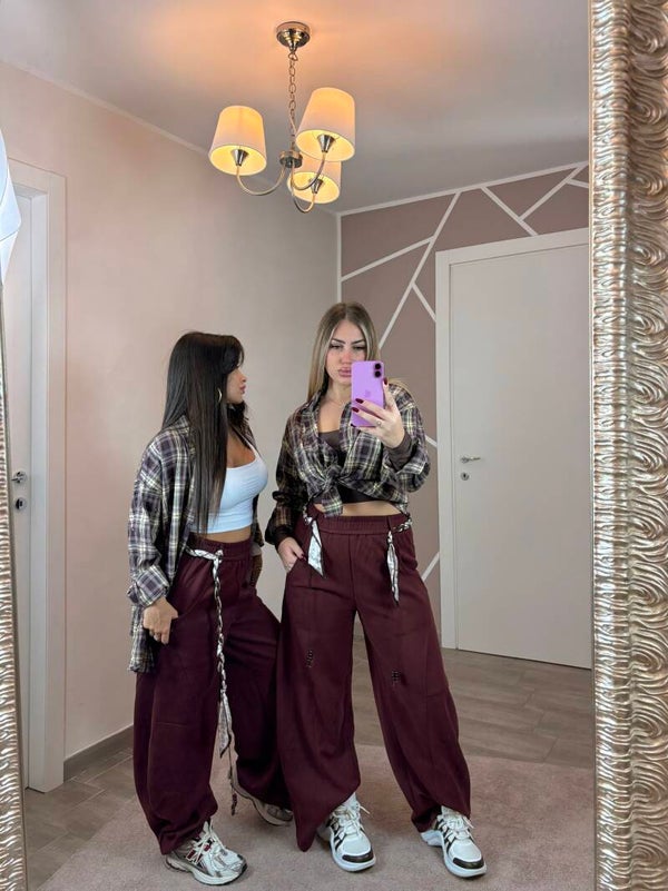 Pantalone wide leg con dettagli intrecciati e perline sul fianco, vita elasticizzata e tessuto morbido e strutturato. La cinta si puo rimuover