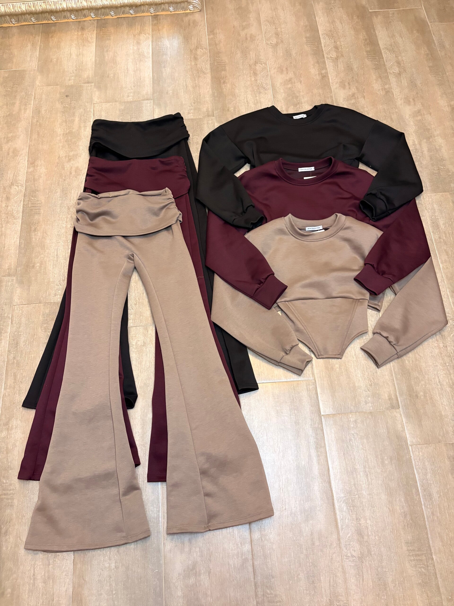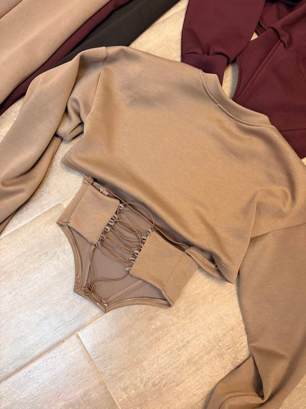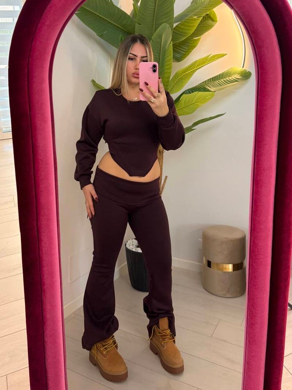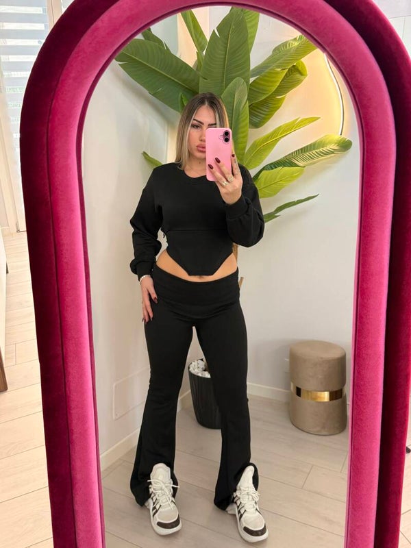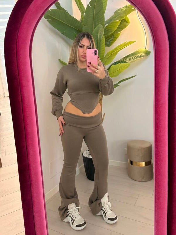 Completo in tessuto morbido e confortevole, composto da felpa crop con retro intrecciato effetto corsetto e pantalone a zampa con fascia doppia in vita che valorizza le forme.