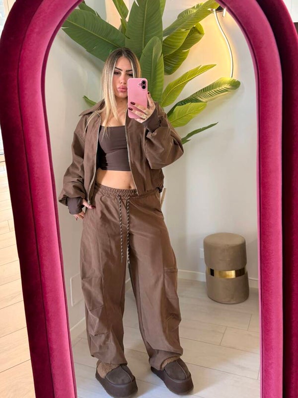 Completo in tessuto effetto camoscio morbidissimo, composto da bomber foderato all’interno e pantalone a vita alta con coulisse regolabile.