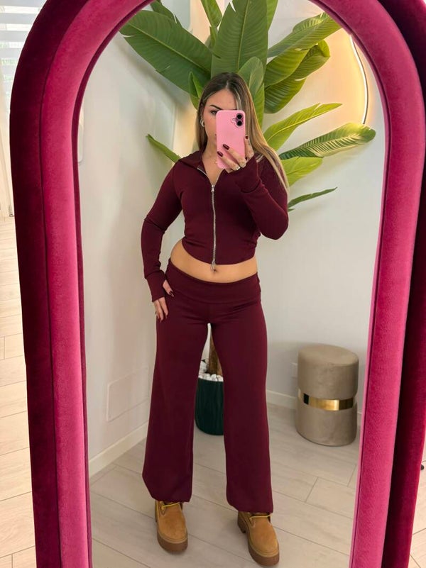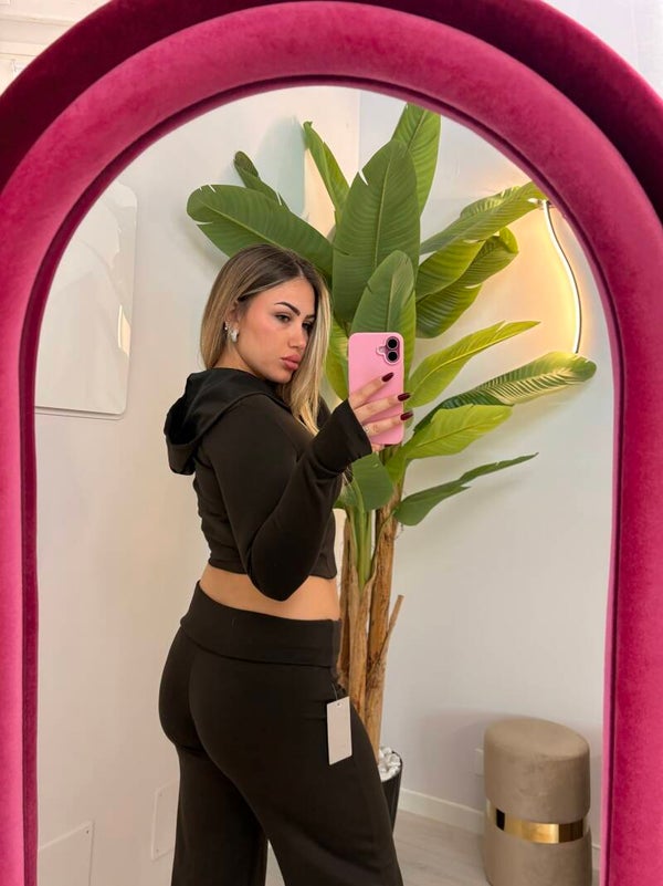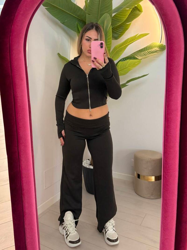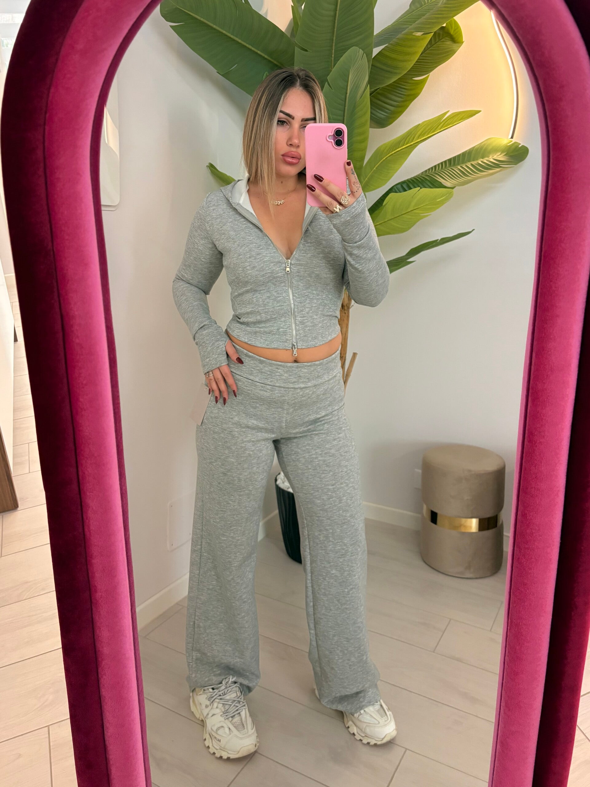 Completo realizzato in tessuto morbido e avvolgente, composto da felpa con zip aderente in vita e manica a guanto, e pantalone dal taglio slim con doppio tessuto in vita che valorizza la silhouette.