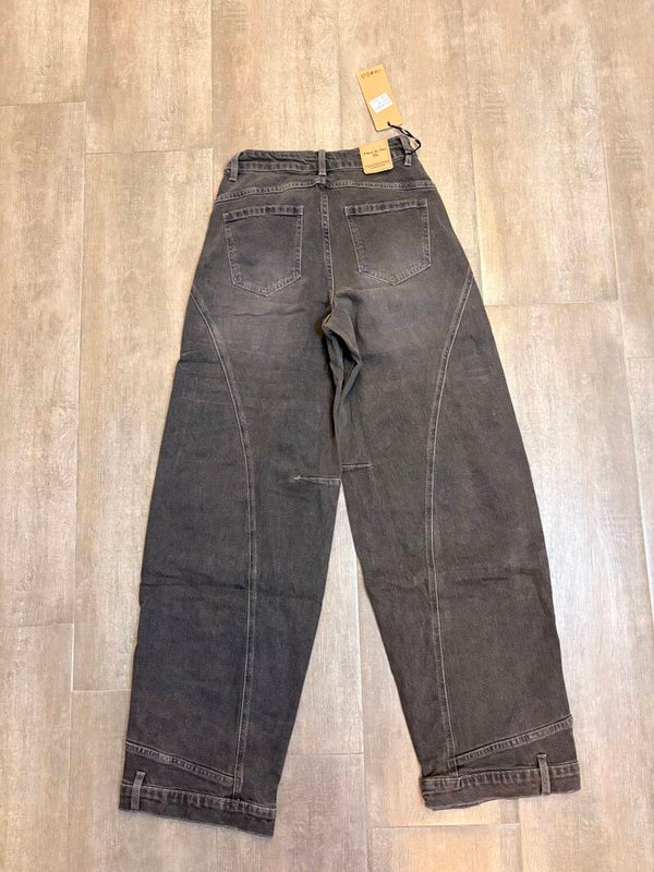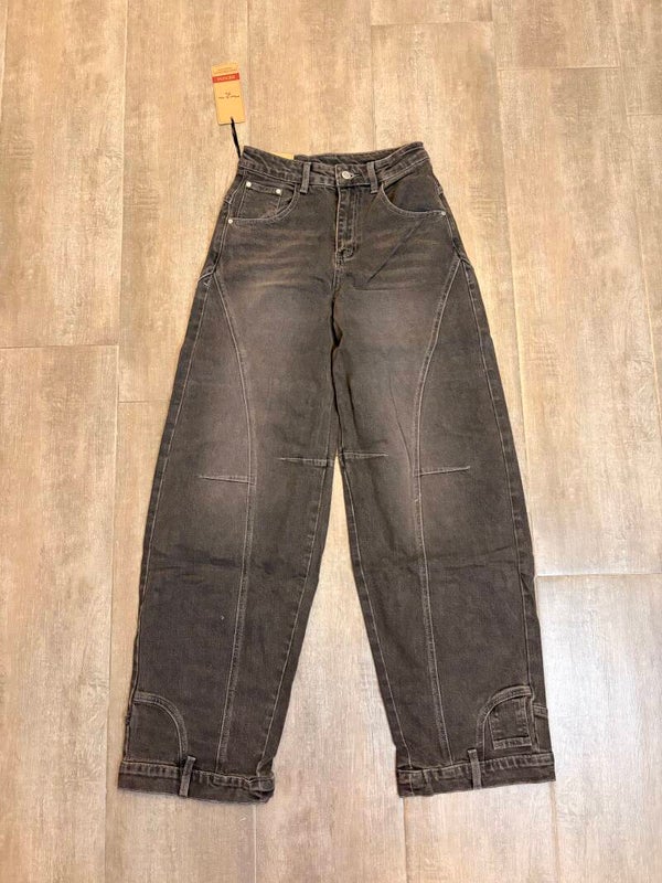 Jeans modello balloon fit con tagli strutturati e cuciture a vista che valorizzano la gamba. Fondo regolabile con fibbie laterali e dettaglio cucitura arcuata sul retro