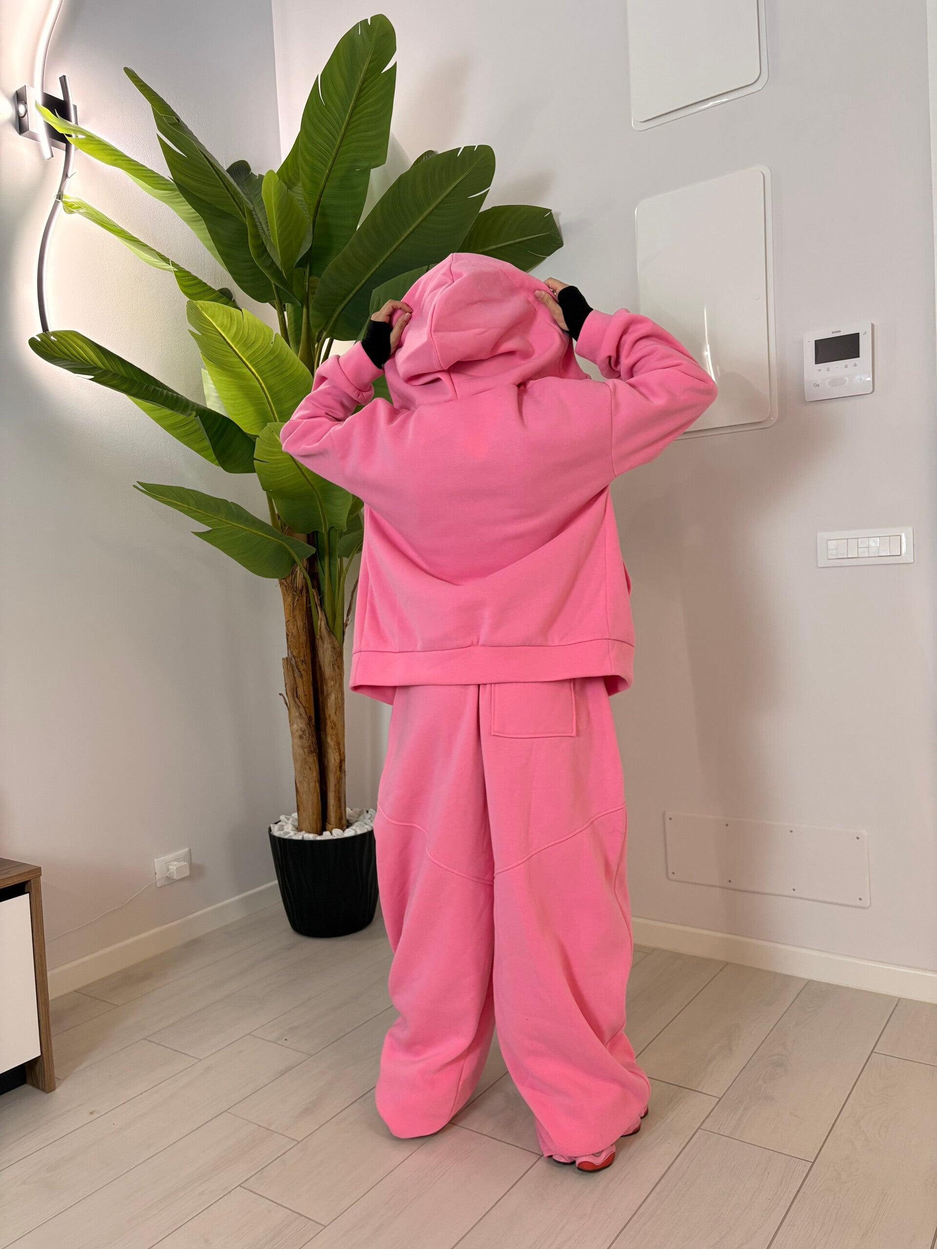 Tuta felpata super morbida e calda, composta da felpa con zip oversize e pantalone ampio effetto balloon. Il tessuto interno effetto pile regala comfort assoluto senza rinunciare allo stile.