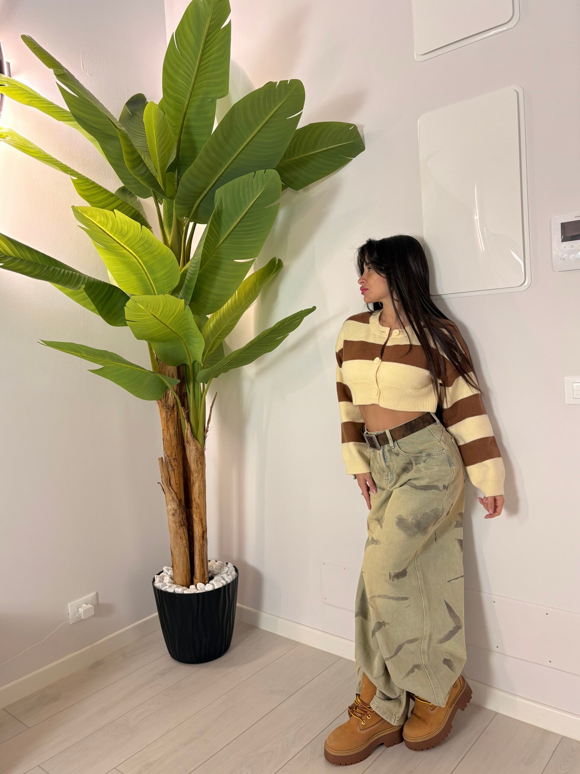 Maglioncino corto in lana morbida con fantasia a righe panna e caramello. Il fit aderente ma confortevole valorizza la silhouette, mentre il taglio crop lo rende perfetto da abbinare a jeans a vita