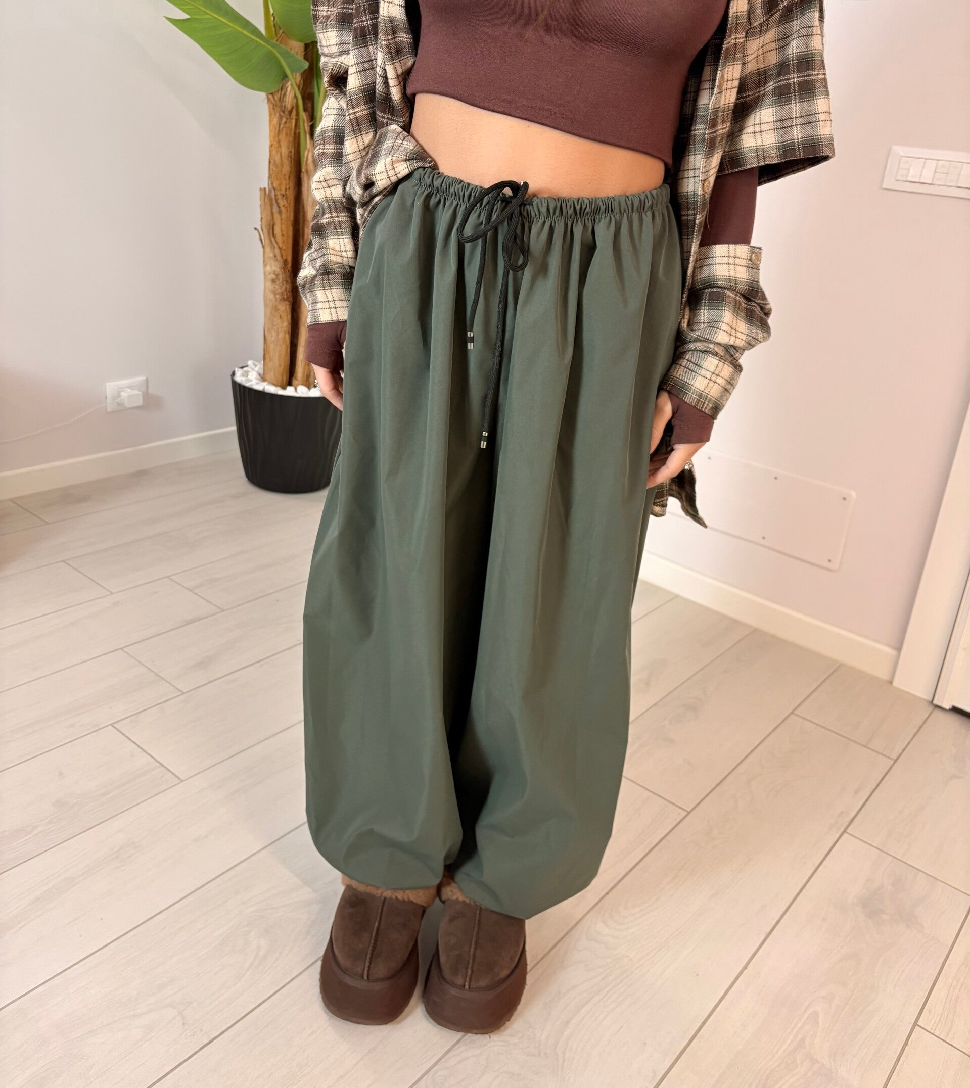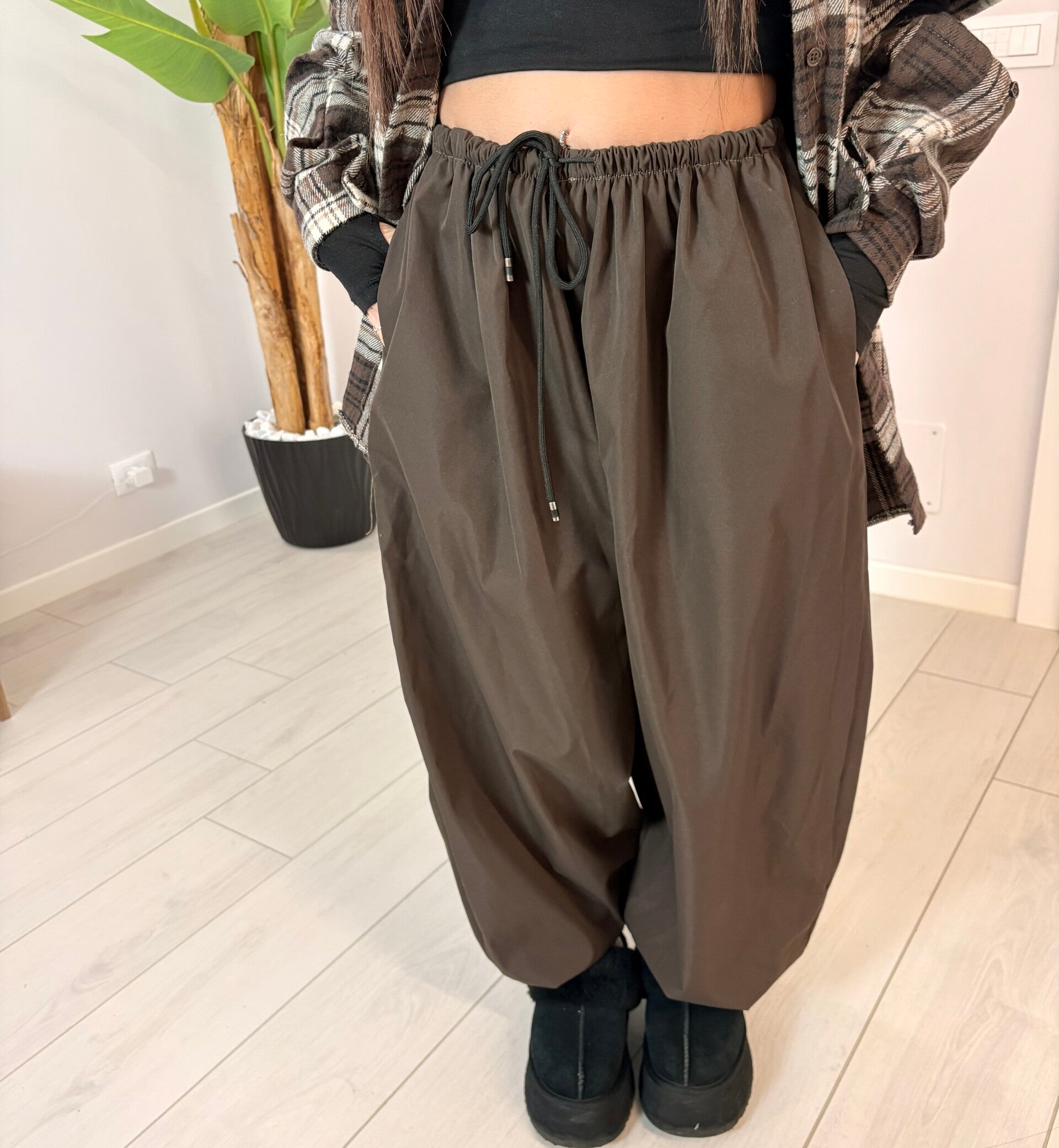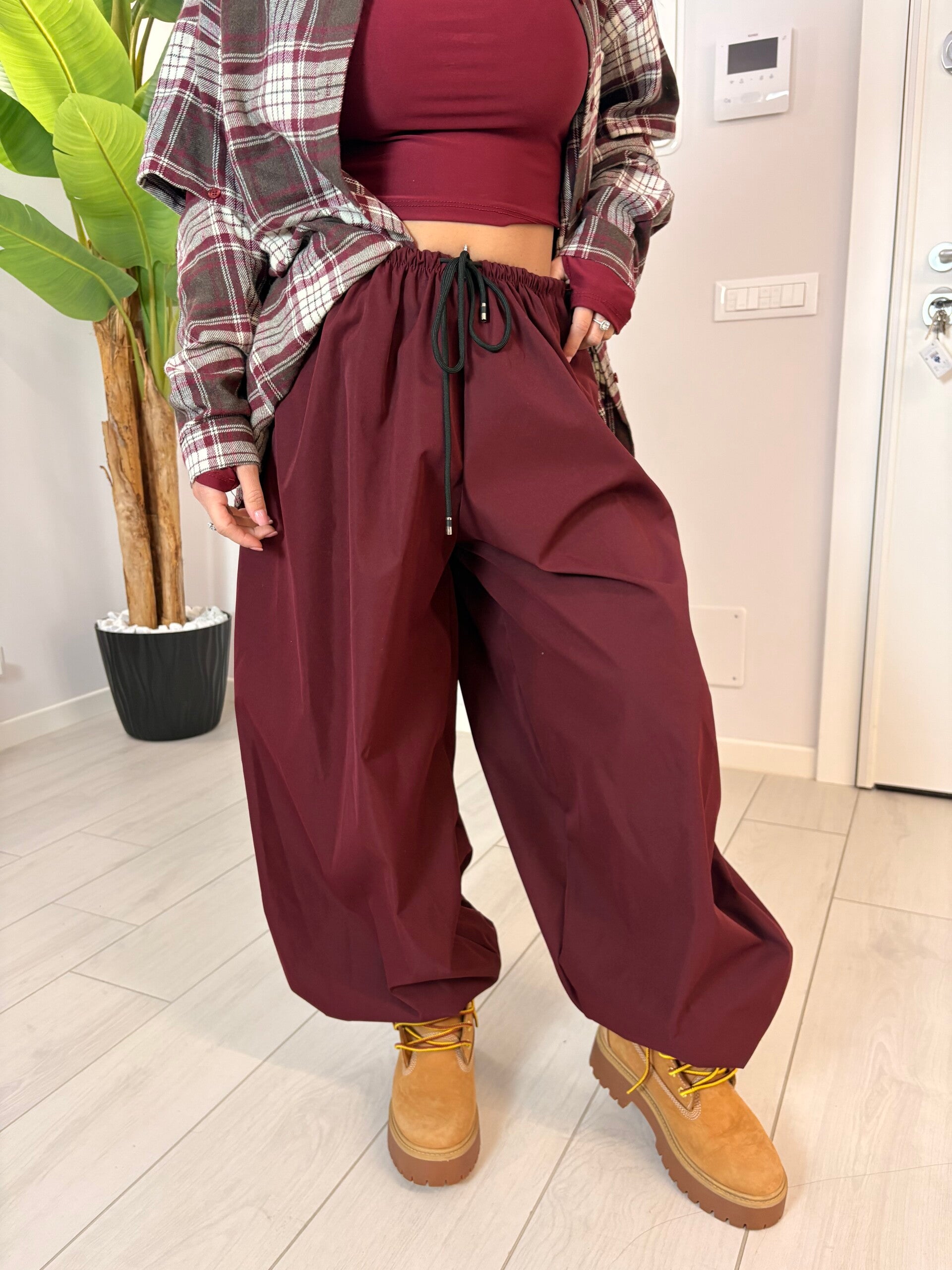 Pantalone ballon tessuto tecnico con vita elasticizzata e coulisse regolabile. Il tessuto è tecnico, leggero e dalla caduta morbida, perfetto per creare un effetto oversize ma sempre curato.