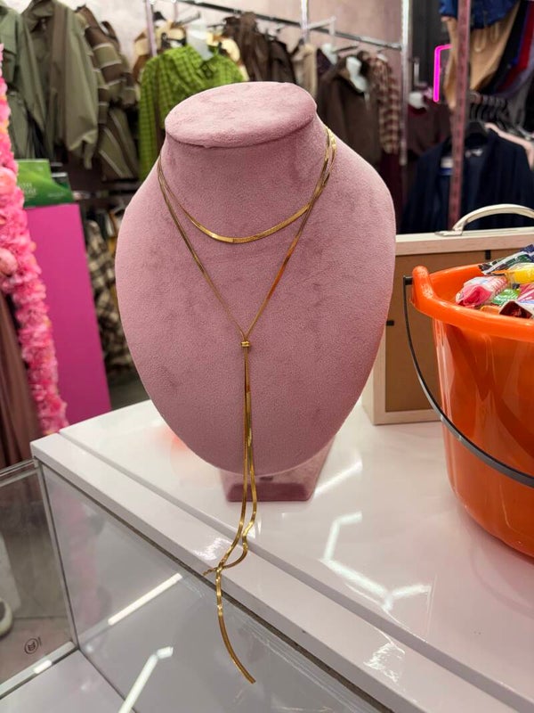 Collana regolabile con chiusura a pallino scorrevole che permette di adattarla al décolleté.