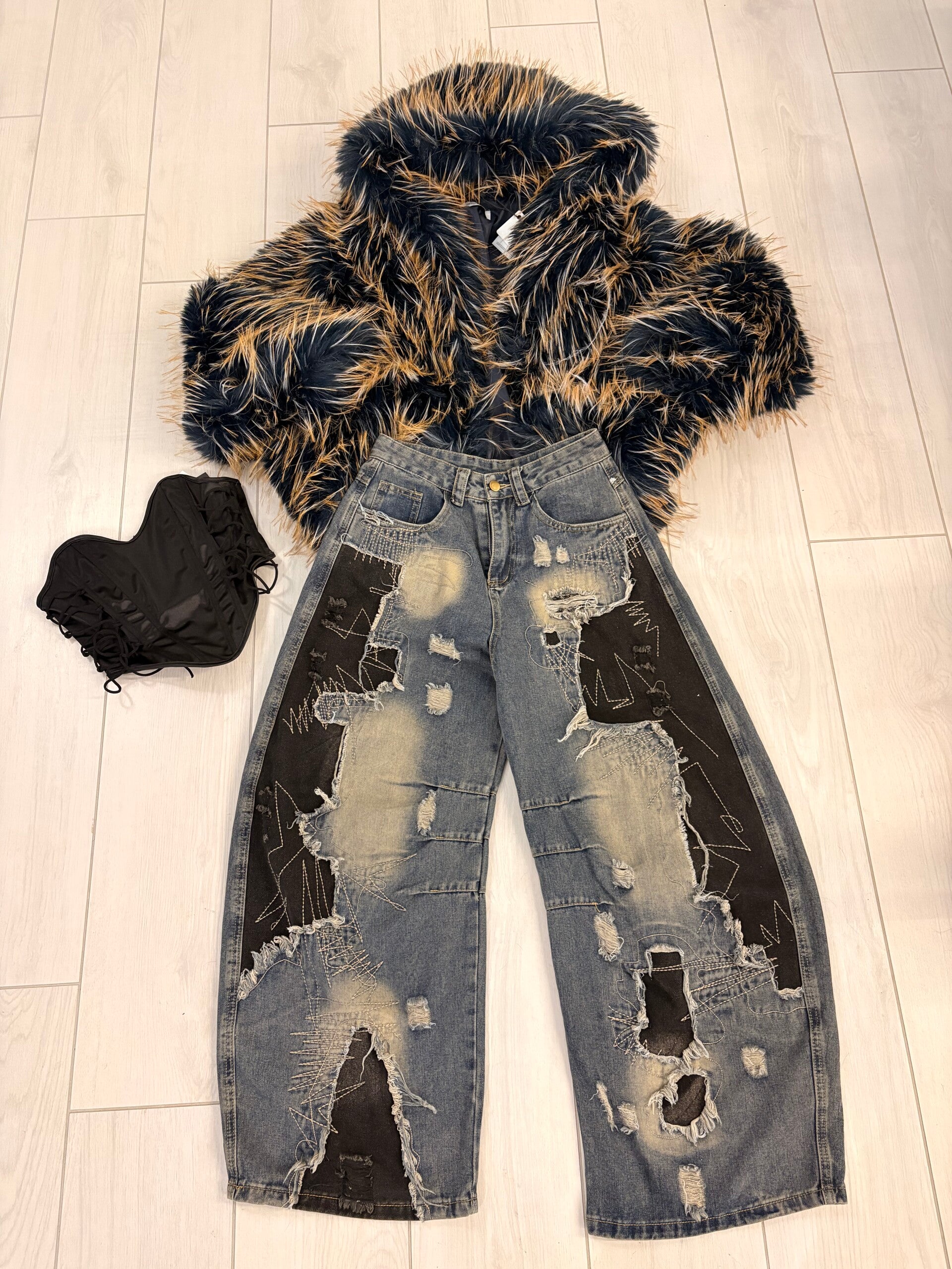 Jeans modello balloon con strappi e inserti neri effetto patch. Vita alta, vestibilità morbida, tessuto denim rigido. Calza da XS a