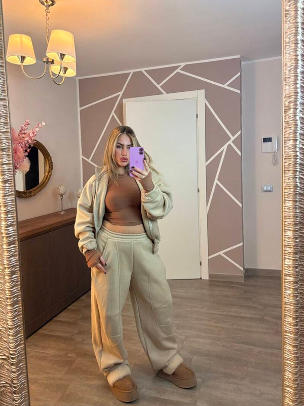 Tuta felpata super morbida e calda, composta da felpa con zip oversize e pantalone. Il tessuto interno effetto pile regala comfort assoluto senza rinunciare allo stile.