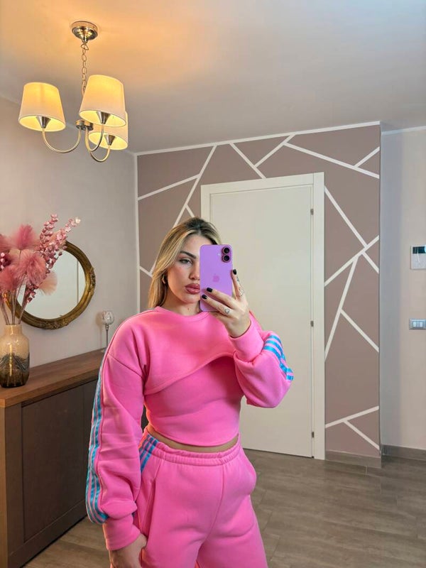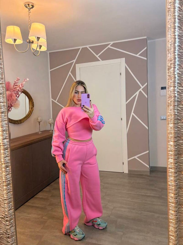 Tuta felpata 3 pezzi super morbida e calda, composta da top elasticizzato, felpa cropped e pantalone wide con bande laterali.