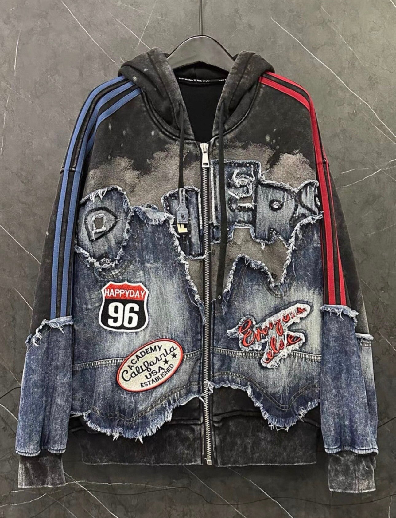 Giacchetto zip con effetto mix denim + felpa nera, caratterizzato da dettagli destroyed, toppe applicate e bande laterali sportive a contrasto.