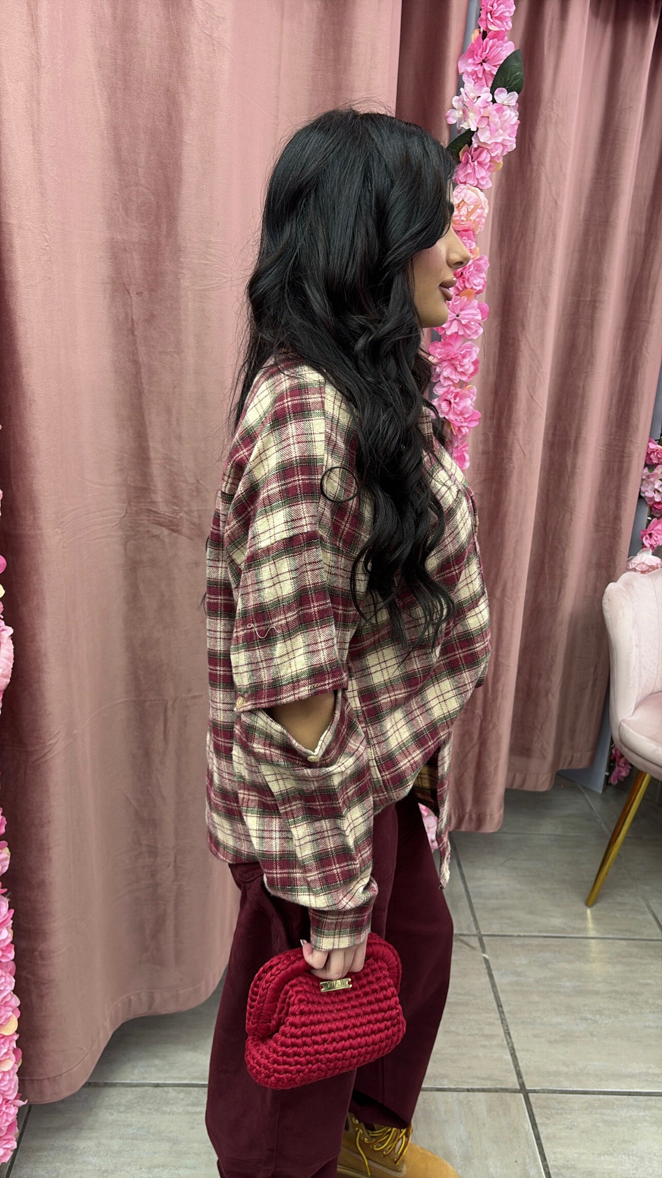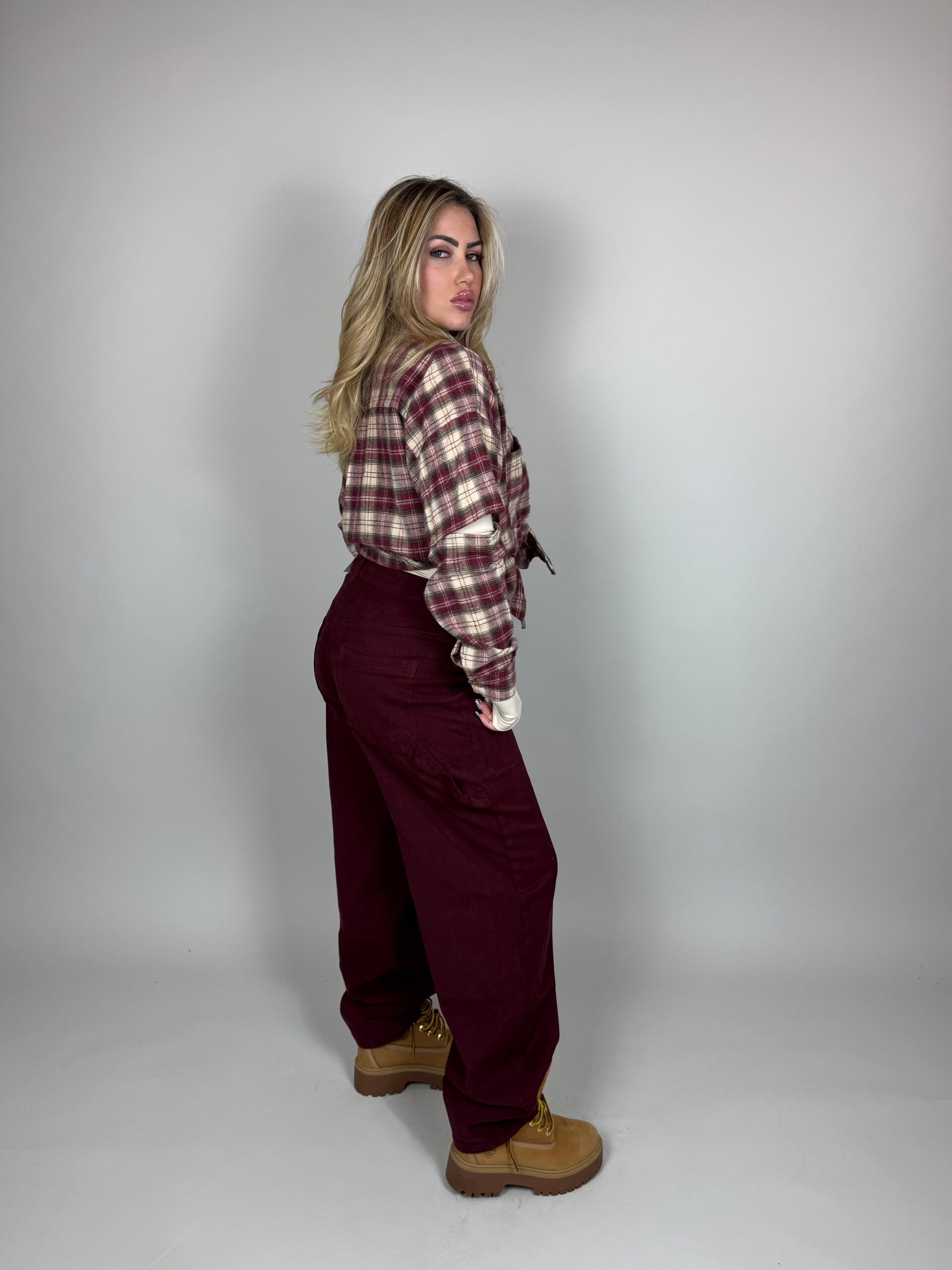 Camicia in morbido tessuto effetto flanella, caratterizzata da fantasia a quadri nei toni del borgogna e panna. Modello oversize con spalla scesa per un look casual e super comfy.
