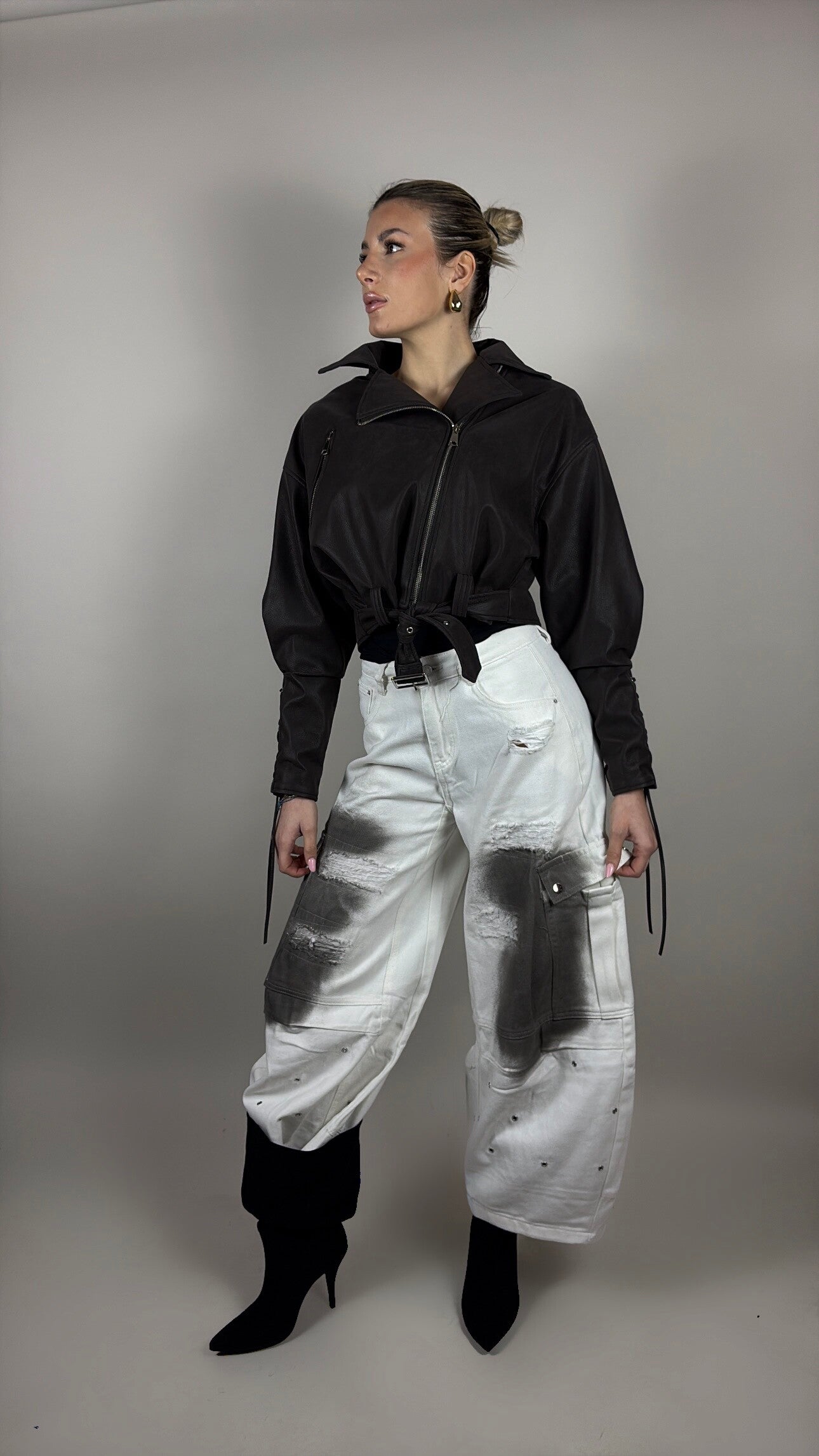 Giacchetto in ecopelle effetto matte, taglio bomber e dettagli laterali con laccetti metal eyelet che donano un mood super street. Modello corto con cintura regolabile in vita, zip frontale e maniche morbide.