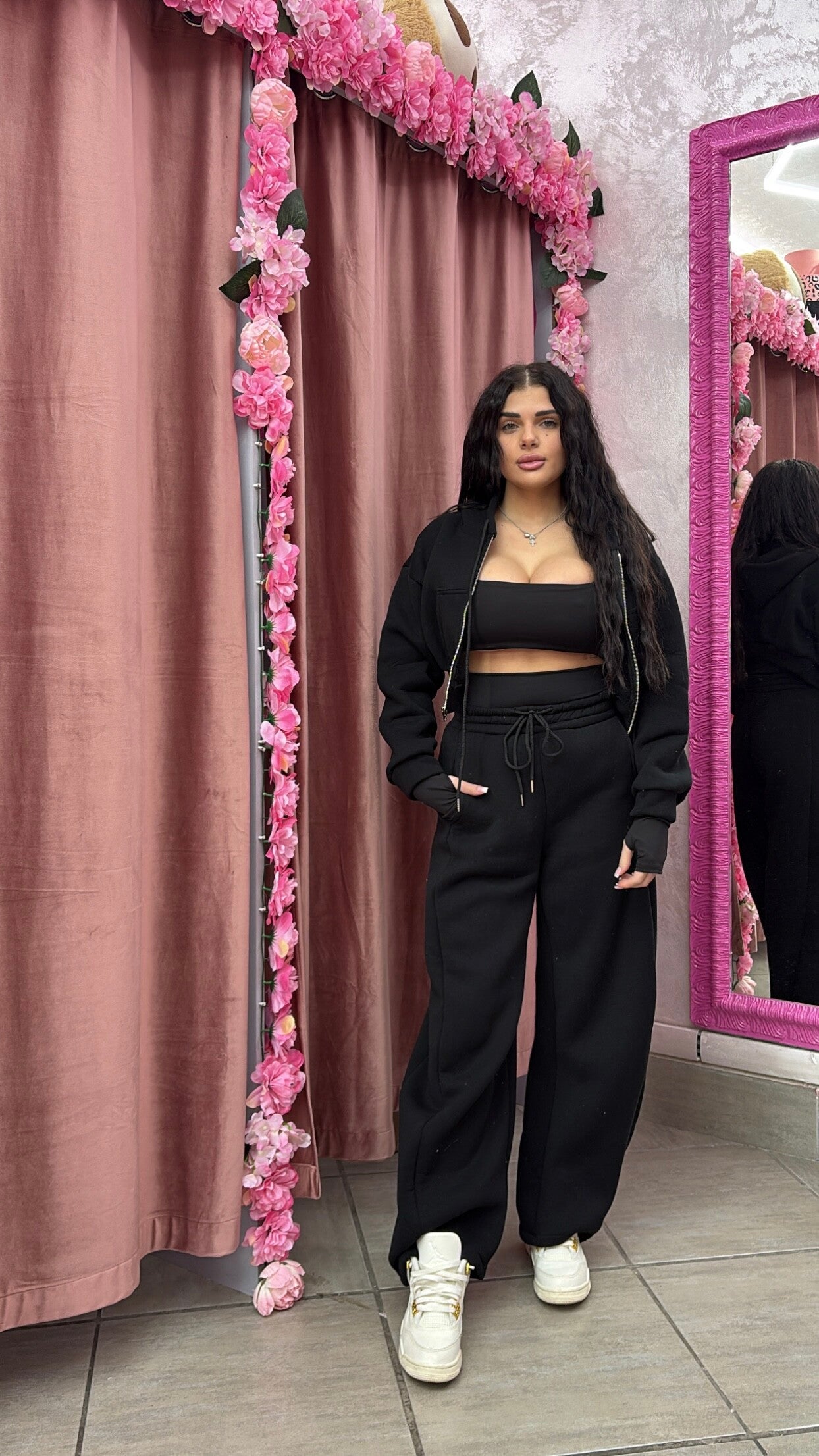Tuta felpata da donna dal design moderno e confortevole, perfetta per un look casual ma curato. Composta da pantalone a vita alta con coulisse regolabile e top corto con scollo squadrato, abbinabile alla felpa con zip e cappuccio per un outfit completo e versatile.