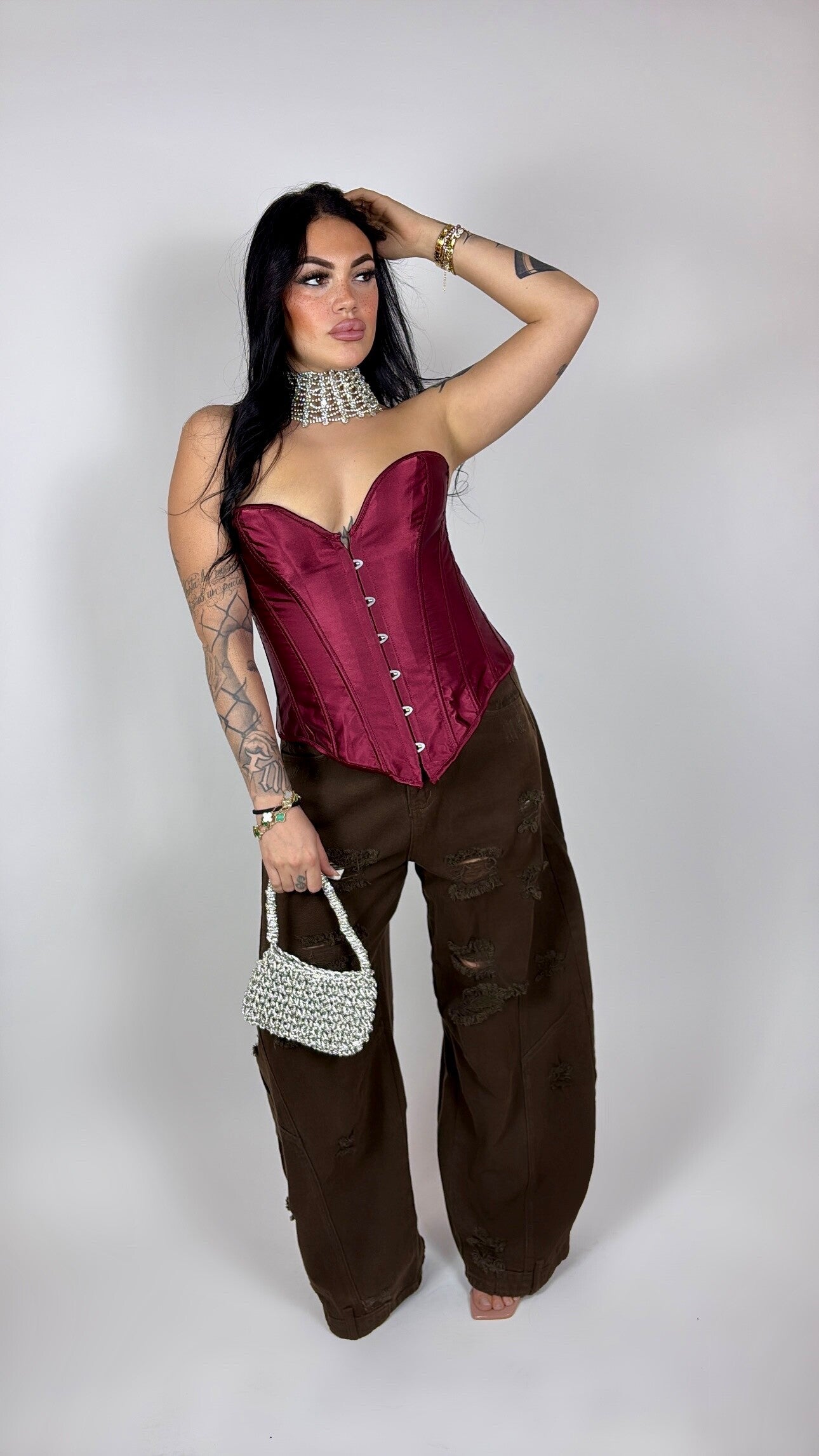 Realizzato in raso lucido effetto satin, questo corsetto dal taglio strutturato esalta la silhouette con un fit aderente e sensuale.