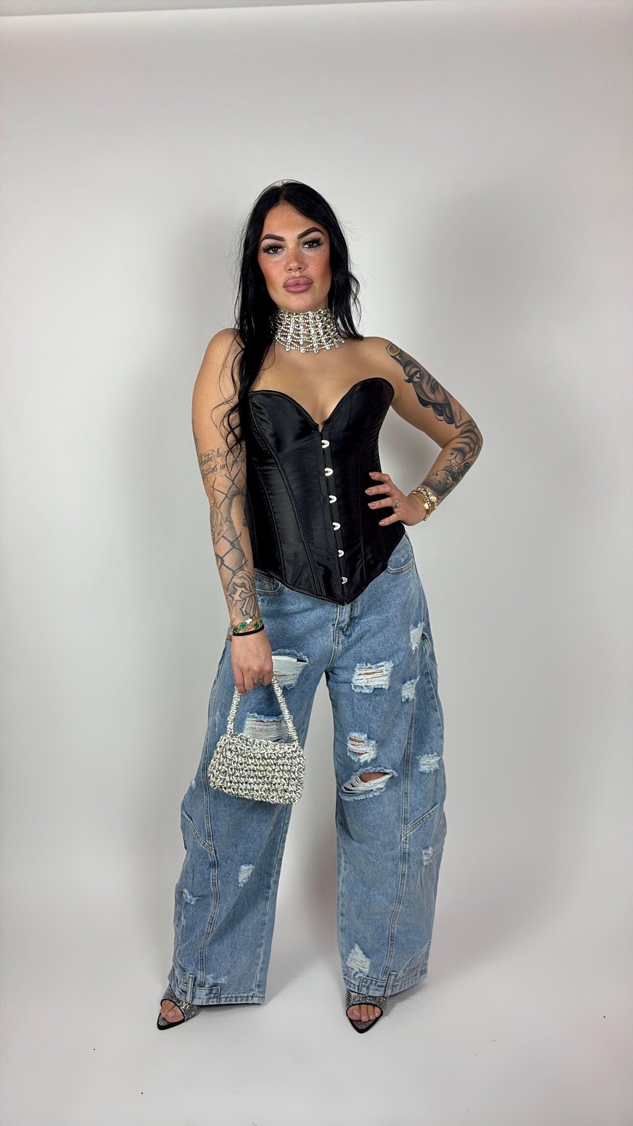 Realizzato in raso lucido effetto satin, questo corsetto dal taglio strutturato esalta la silhouette con un fit aderente e sensuale.