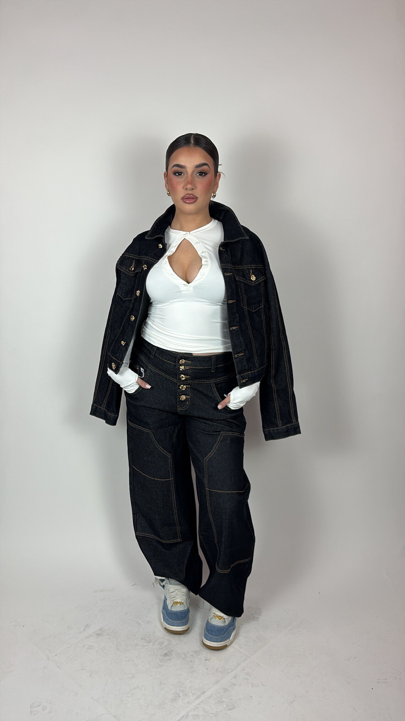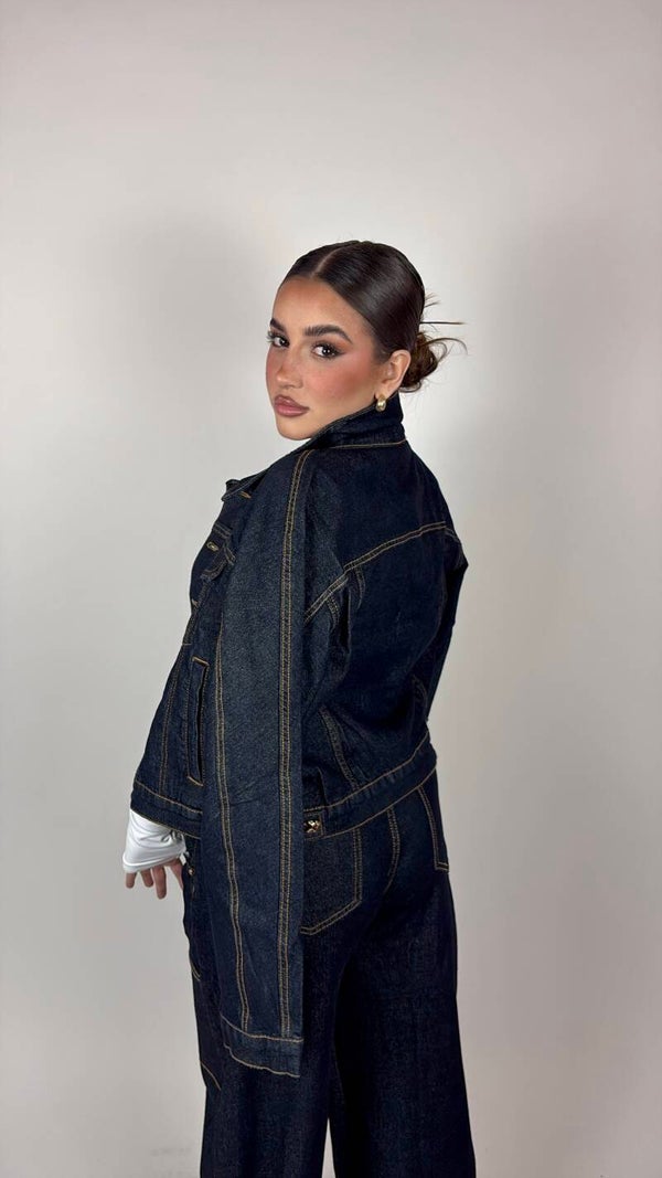 Coordinato composto da jeans e giacchetta cropped con dettaglio bottoni. Il tessuto è fermo, strutturato e di qualità top, perfetto per valorizzare la silhouette e garantire una vestibilità impeccabile.