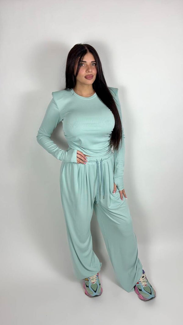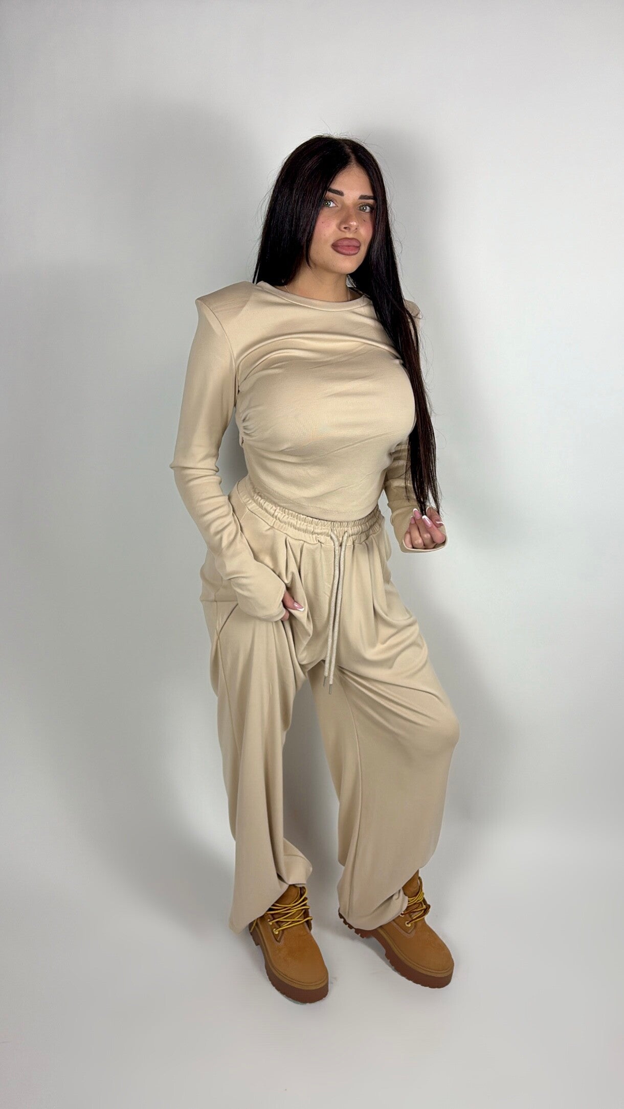 Coordinato Just West con spalline imbottite e drappeggio sui fianchi che valorizza la silhouette. Pantalone lungo elasticizzato e super comodo. Tessuto leggero perfetto per la primavera.