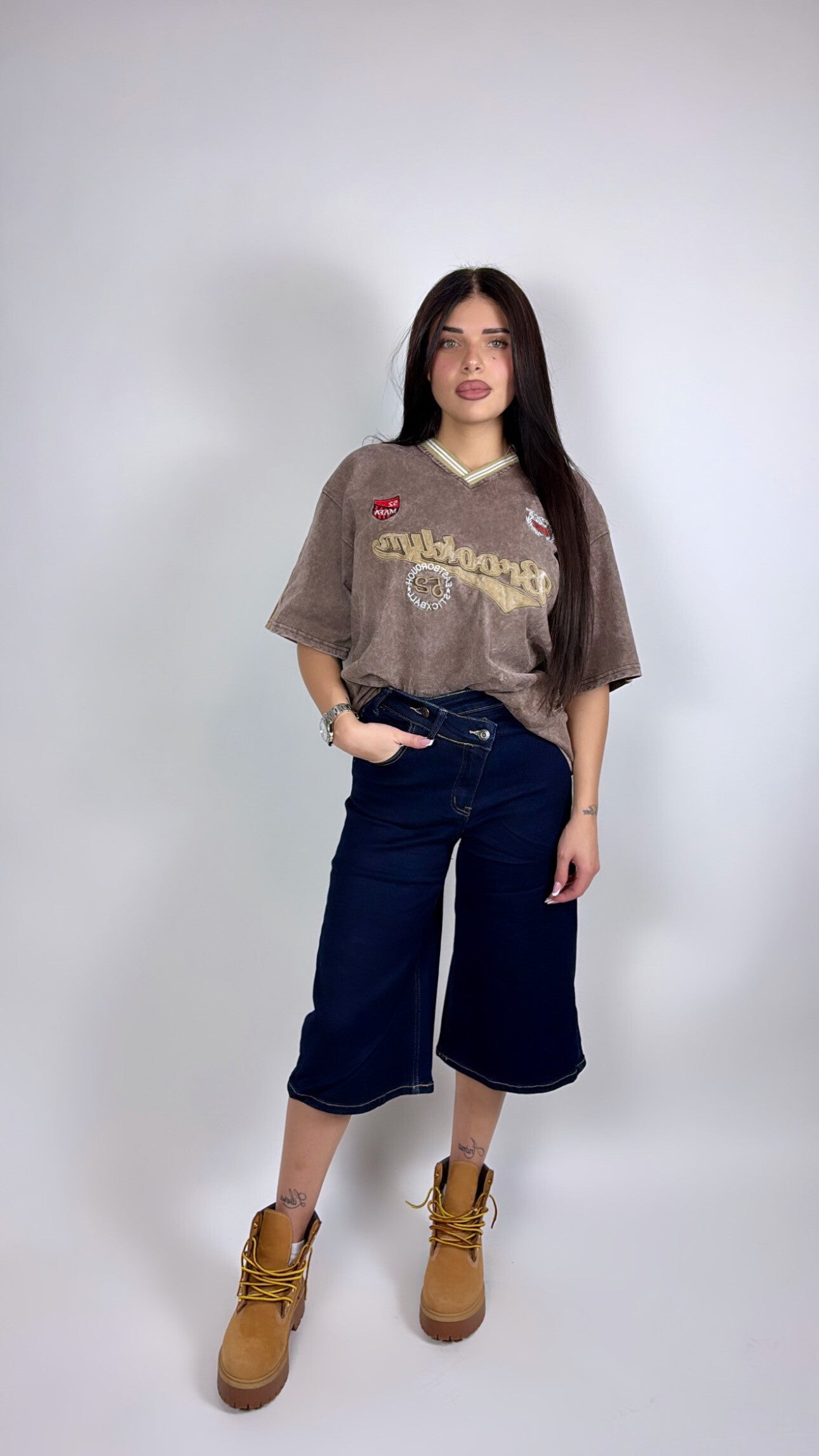 Bermuda in denim colore scuro con chiusura asimmetrica super trendy. Tessuto molto elastico che valorizza la silhouette e garantisce comfort.