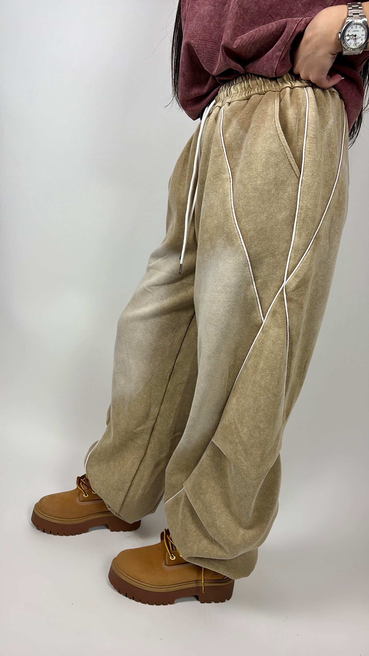 Panta tuta in garza sfumata bianco/crema, leggera e super comoda. Cuciture laterali decorative e coulisse alla caviglia per indossarla sia larga che più stretta.