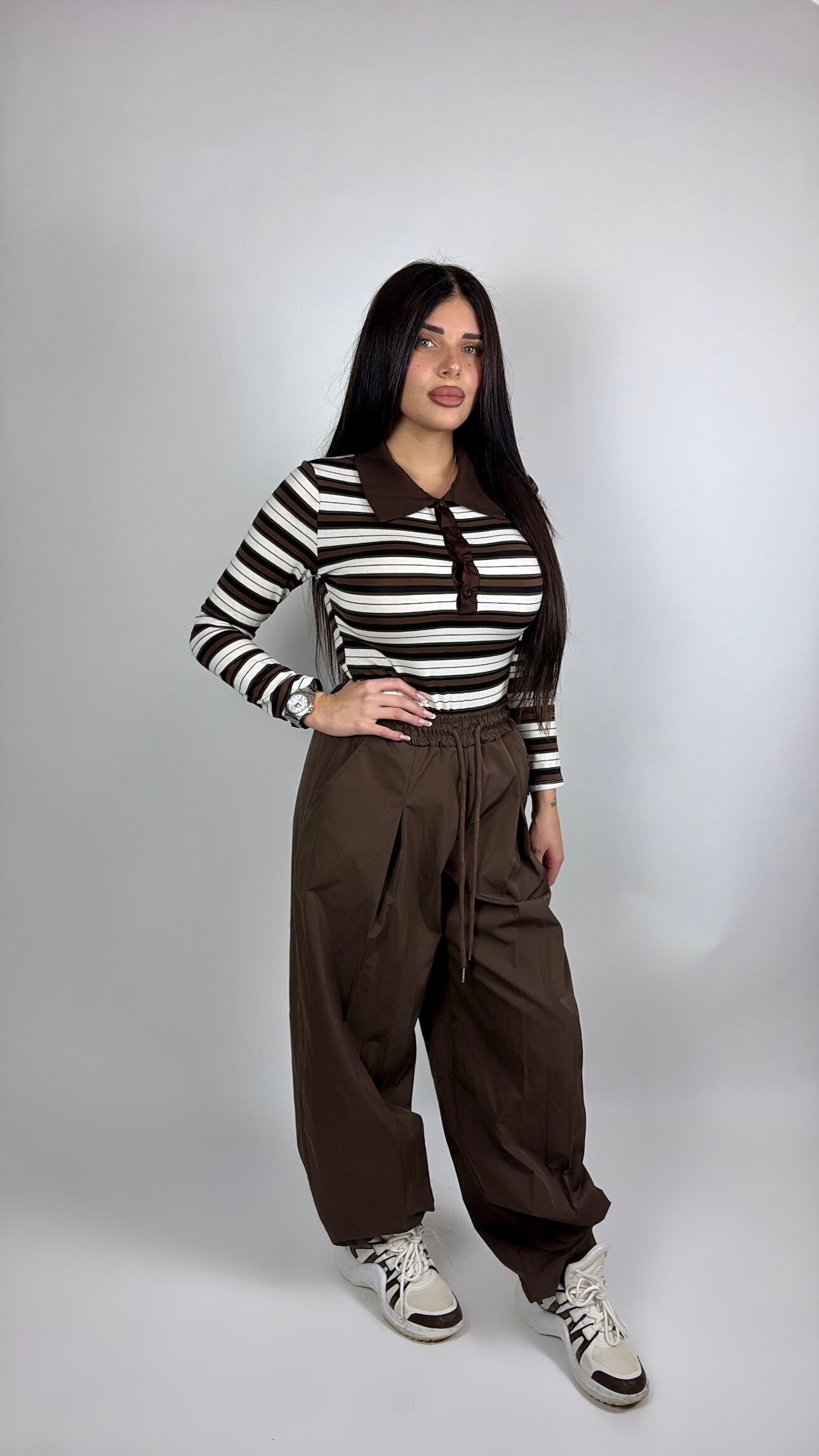 Pantalone in tessuto tecnico leggero, perfetto per la primavera. Vita elasticizzata con pieghe frontali e gamba ampia per un look comodo e super elegante.