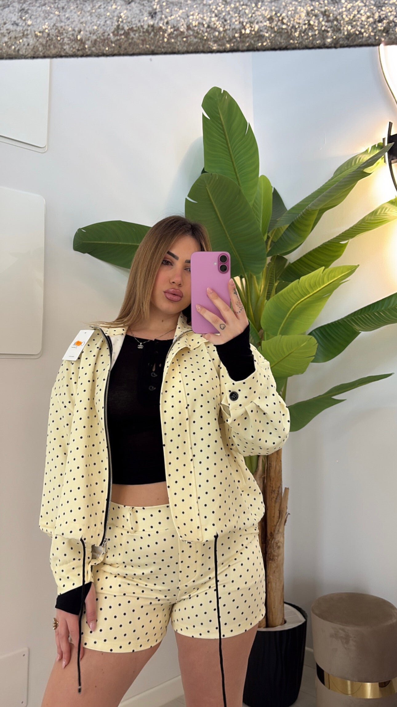 Set super trendy composto da giacca crop con zip e shorts coordinati a pois ✨