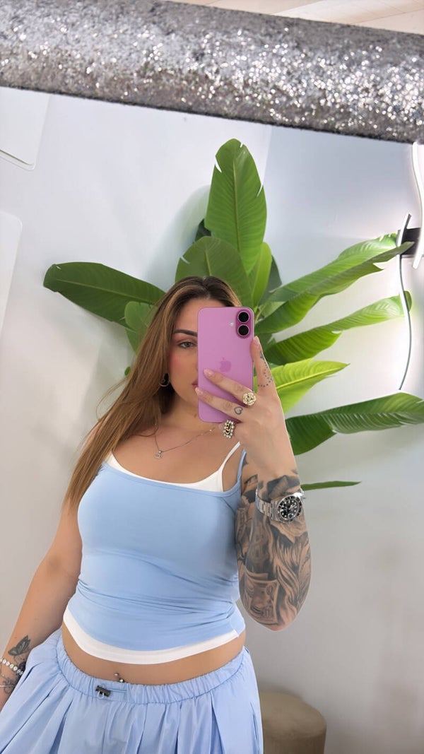 Canottiera dal design contemporaneo a doppio strato che crea un effetto a contrasto elegante e moderno. Il taglio morbido rende il capo versatile per un look casual o più curati.Perfetta da abbinare su un jeans,pantalone o gonna, dona stile e originalità senza rinunciare alla semplicità.