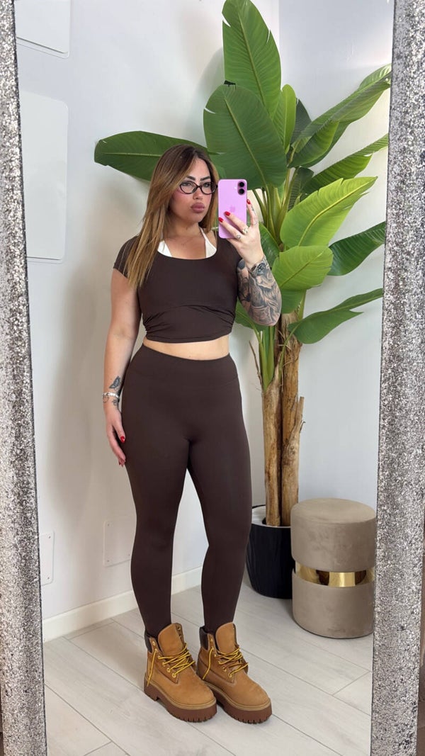 Coordinato bicolor super modellante con top aderente e leggings vita alta 🤍Comodo, elasticizzato e perfetto per look sporty-chic.