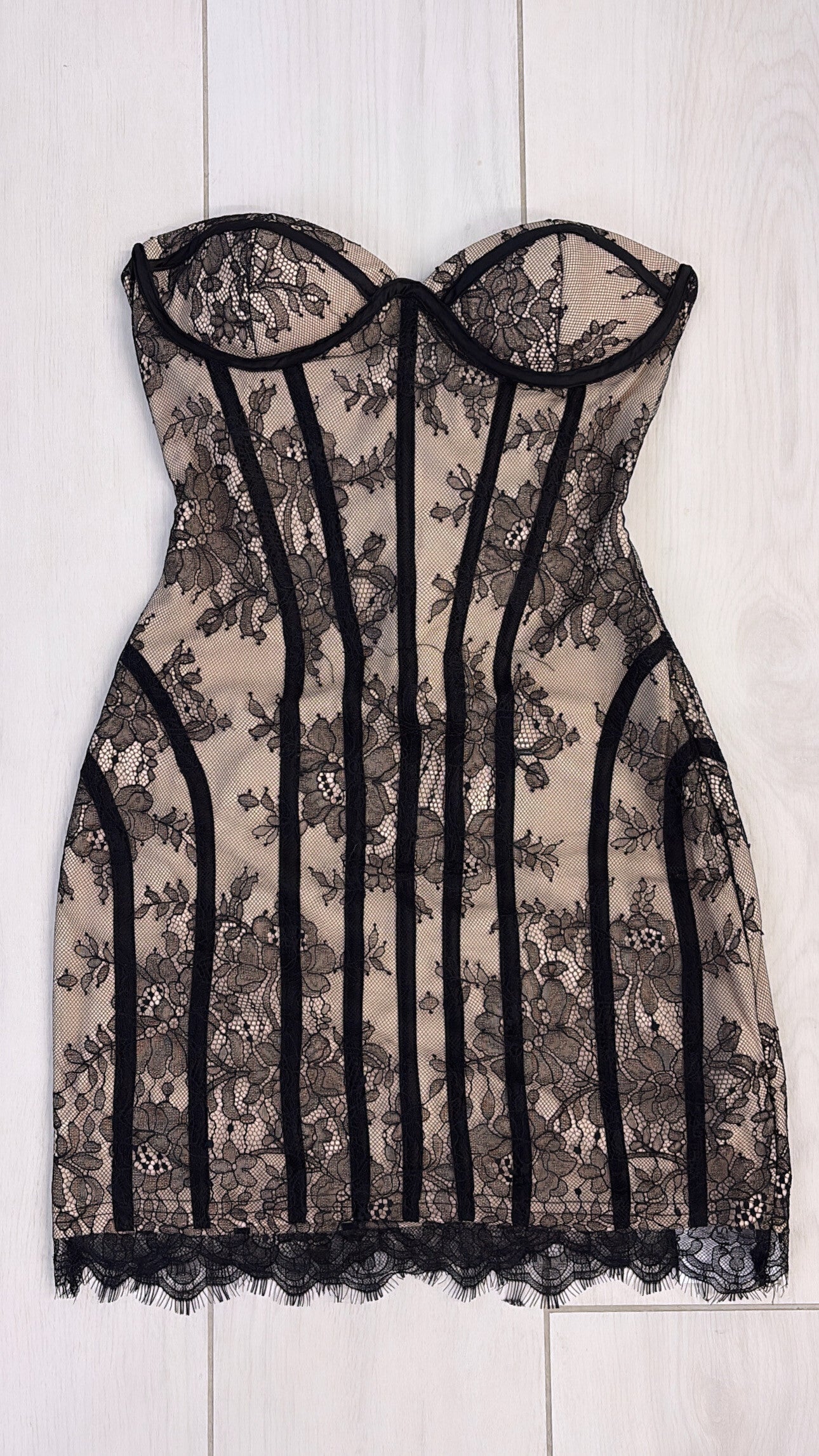 Abito corto effetto corsetto in pizzo nero su base nude, super femminile e modellante. Struttura con stecche che valorizza il punto vita, coppe sagomate e chiusura con lacci sul retro per una vestibilità regolabile e perfetta. Fondo rifinito in pizzo per un tocco sensuale.
