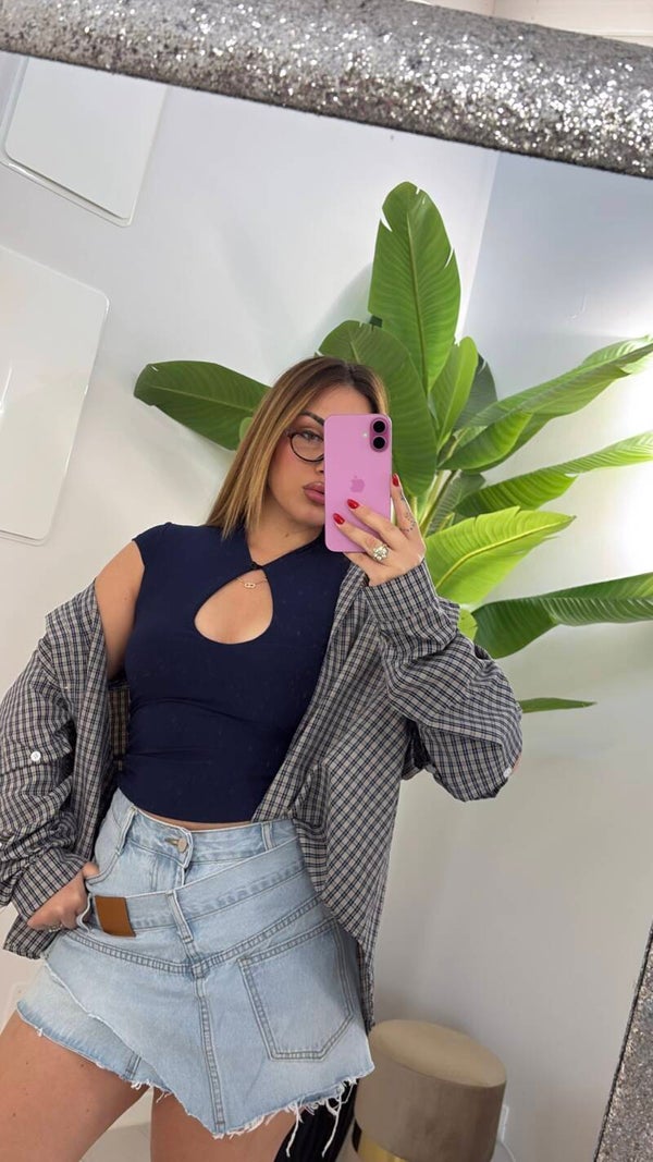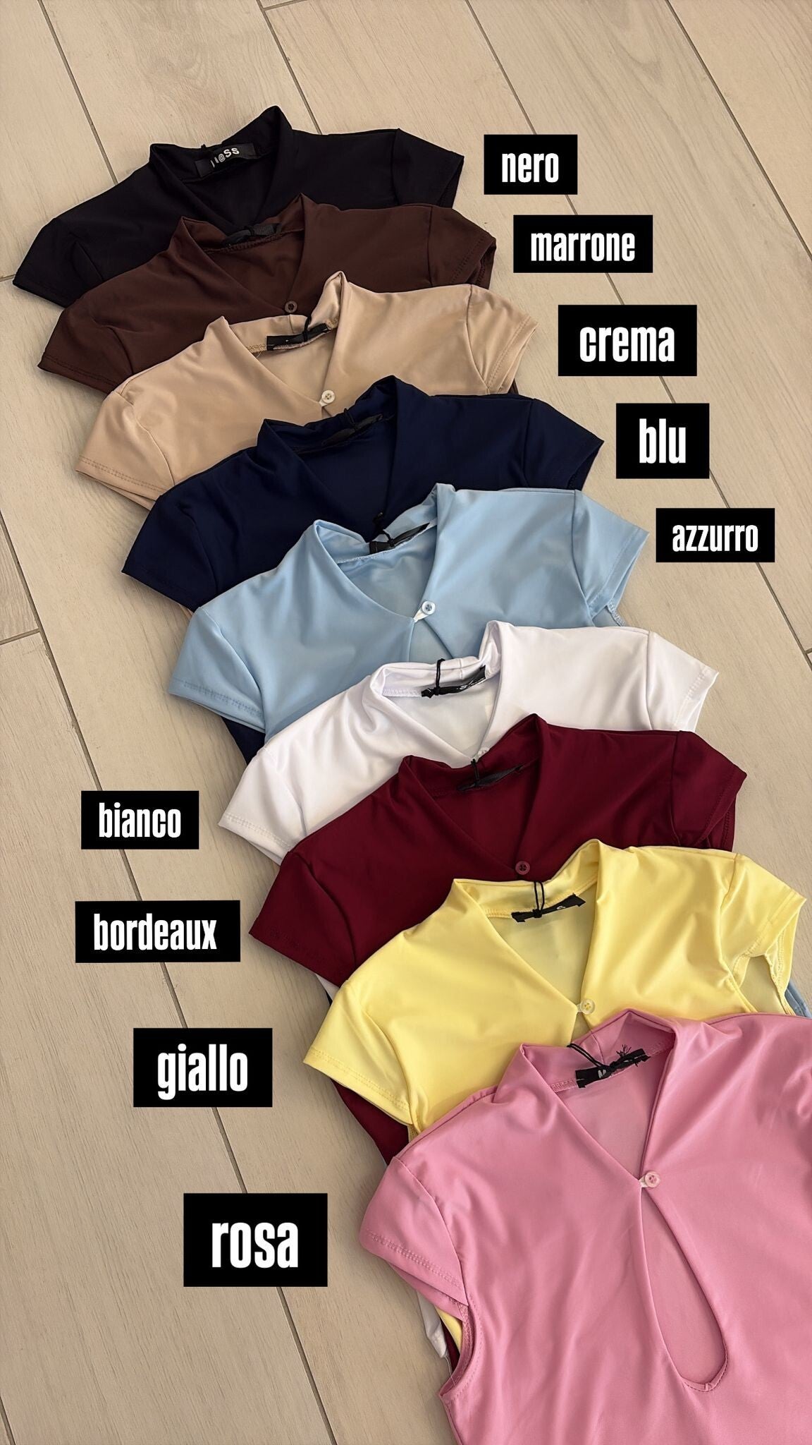 Maglia in lycra dal fit aderente e confortevole, che valorizza la silhouette con eleganza. La particolarità è un delicato taglio a goccia sul seno con chiusura a bottone, dettagli che donano un tocco sensuale e ricercato.