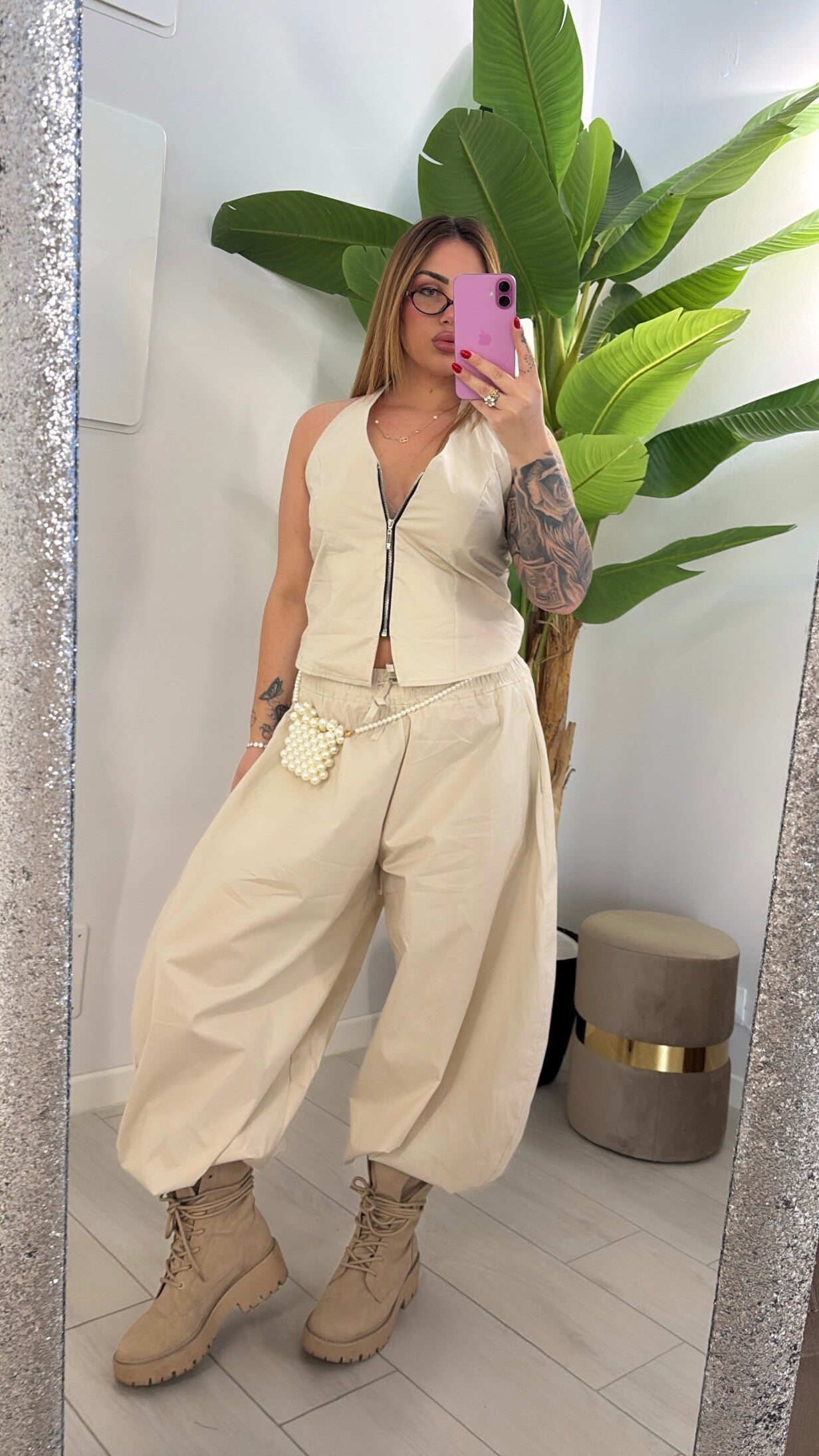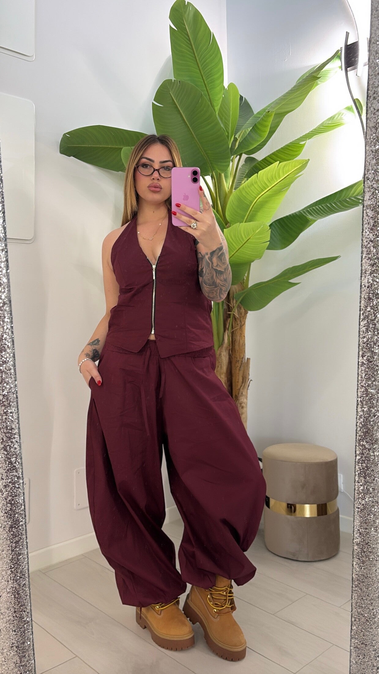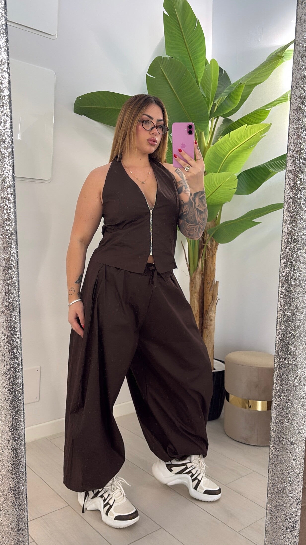 Coordinato sofisticato e contemporaneo, pensato per valorizzare la silhouette con eleganza e comfort. Il pantalone dal taglio morbido e fluido, accarezza le forme con naturalezza, scivolando leggero lungo le gambe e creando un movimento armonioso ad ogni passo. La vita è regolare. Il top completa il look con un design deciso e femminile:LA ZIP FRONTALE aggiunge un tocco moderno e funzionale.